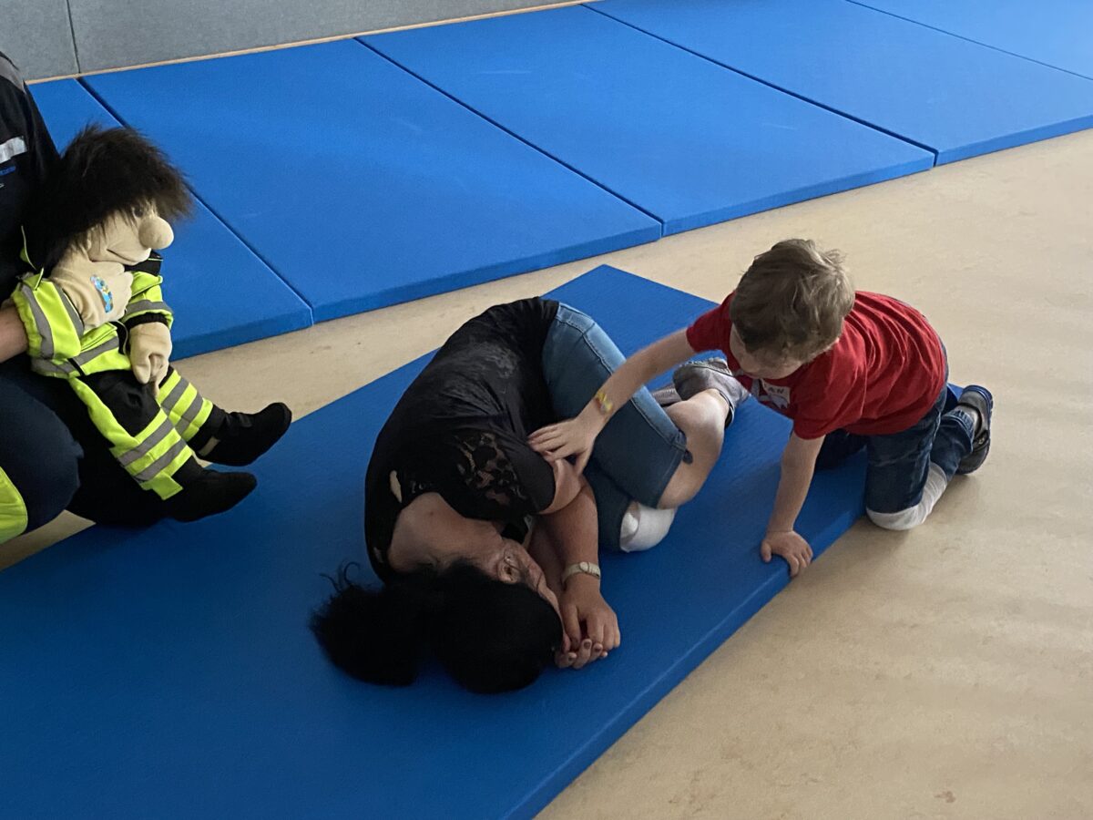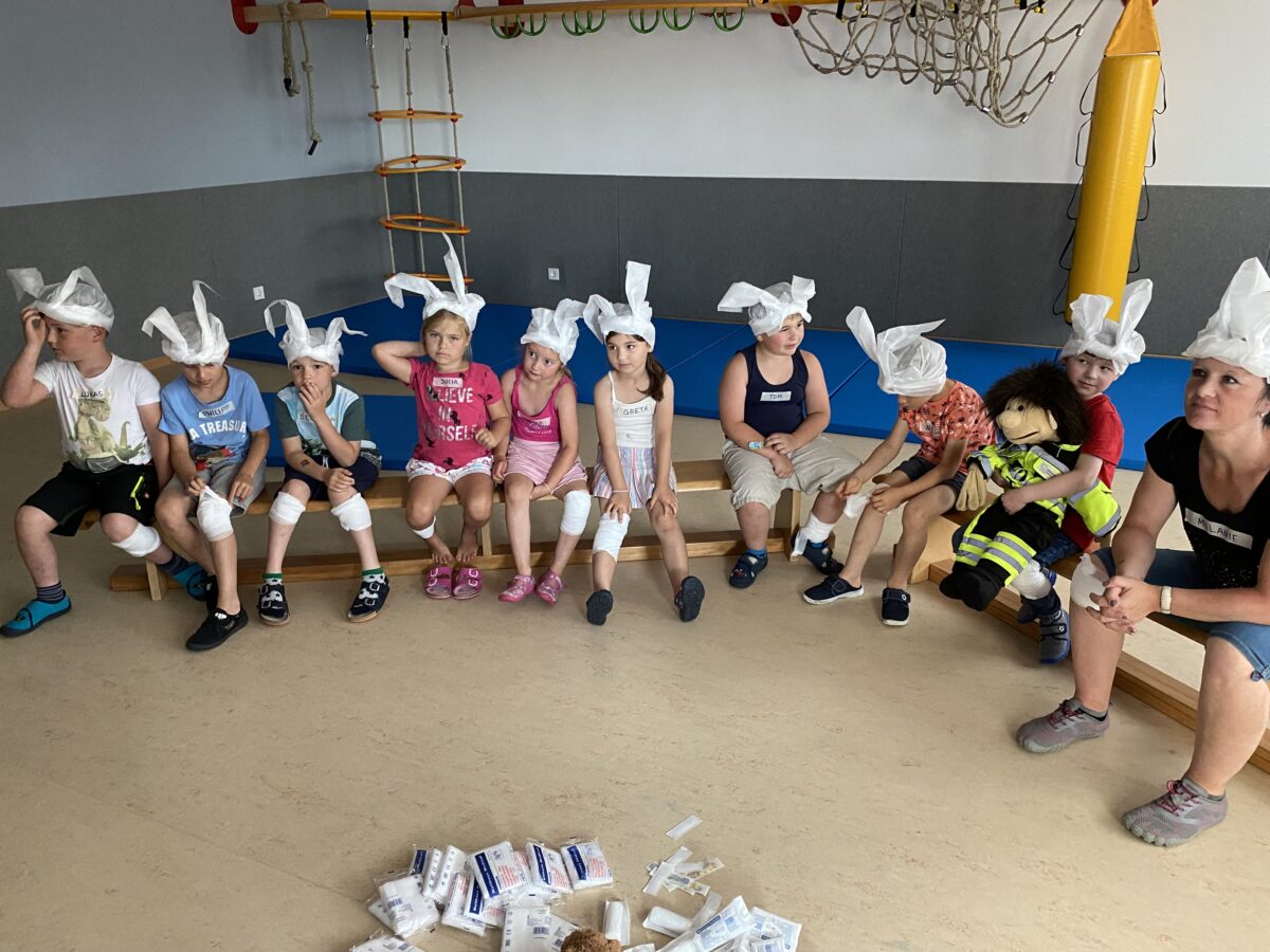 Die „Schlaufüchse“, eine von vier Gruppen des Kinderhauses waren mit Begeisterung dabei und wickelten Verbände, klebten Pflaster, beruhigten und trösteten die „Verletzten“ in kindgerechter stabiler Seitenlage. Gelernt wurde auch, Gefahren zu erkennen und einen Notruf abzusetzen. Als zusätzliche Belohnung gab es noch bunte, extra angefertigte Kindereinmalhandschuhe und etwas zum Naschen.