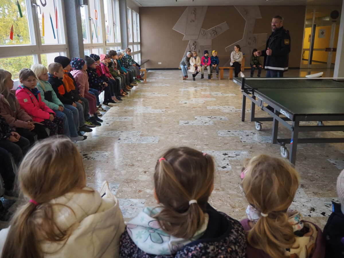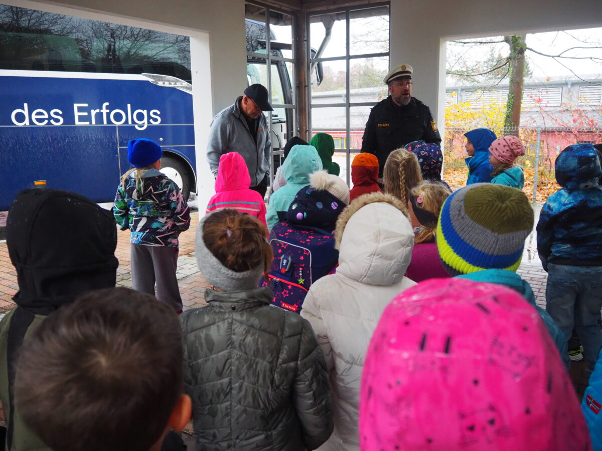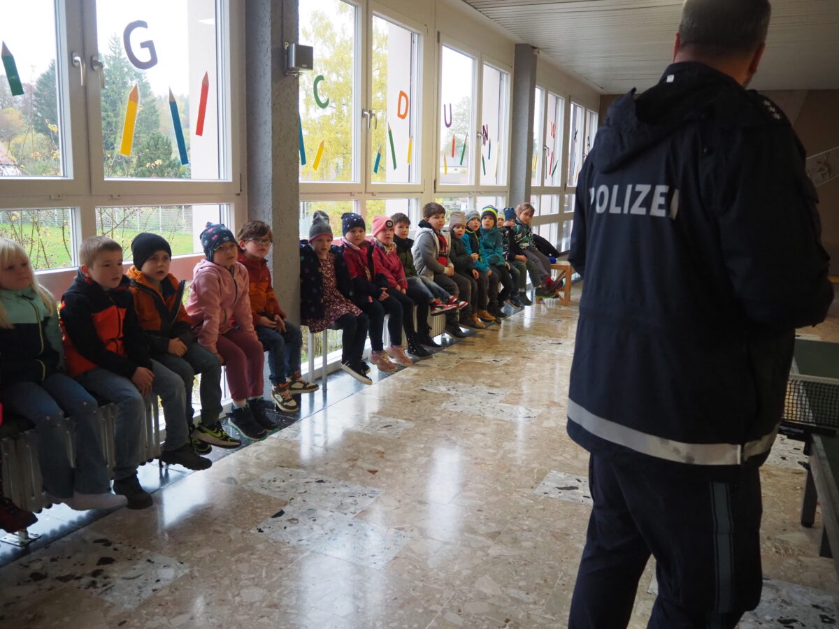 Polizeioberkommissar Carsten Landgraf begrüßte die Schulanfänger zunächst in der Aula. Er besprach mit ihnen die passende Kleidung in der dunklen Jahreszeit und erklärte, wie wichtig es sei, bei Regen, Nebel und Dunkelheit gut sichtbar zu sein. Helle Kleidung und Reflektoren an der Schultasche machen die Kinder im Straßenverkehr auffällig und für die anderen Verkehrsteilnehmer rechtzeitig erkennbar. Den Klassenleiterinnen übergab er die Sicherheitsüberwürfe von ADAC und Verkehrswacht für alle Kinder. Diese bringen, über der Kleidung getragen, zusätzliche Sichtbarkeit und sollen in der dunklen Jahreszeit nicht nur auf dem Schulweg getragen werden, sondern auch bei privaten Wegen der Kinder. Danach gab er den Erstklässlern viele wichtige Tipps und Hinweise zum Verhalten an der Bushaltestelle und im Bus.