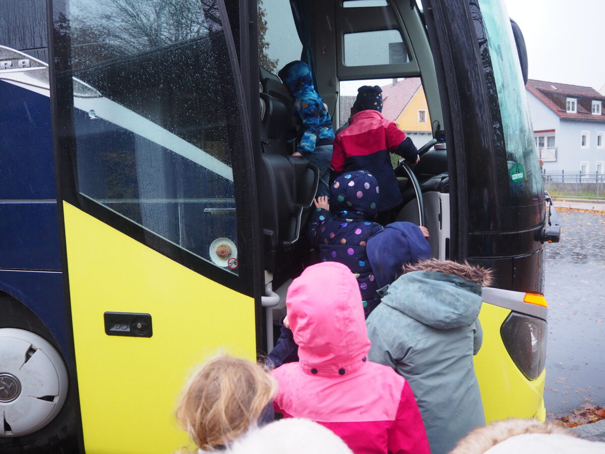 Begleitet von den Lehrkräften Frau Bruischütz und Frau Kiener marschierten die Erstklässler anschließend mit der Schultasche auf dem Rücken zur Bushaltestelle der Schule. Am Bushäuschen wartete auf die Schulkinder bereits der Bus der Firma „Cermak“.