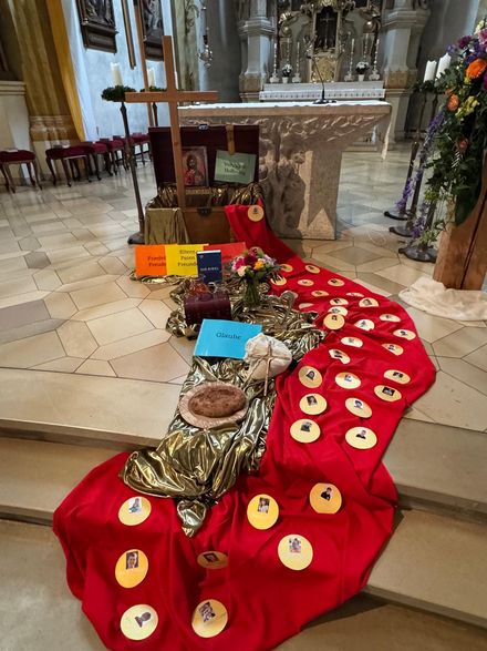 Im Mittelpunkt des Altarraumes stand eine große Schatztruhe, die von den Erstkommunikanten in Begleitung der Gemeindeassistentin Elena Harwardt mit Symbolen der unbezahlbaren Werte des Lebens gefüllt wurde. Dekan Hösl betonte, wir Christen dürfen eines sicher sein: Jesus lädt uns mit seiner Botschaft immer wieder ein. Wichtig ist, dass wir Gott und Jesus gegenüber auch ständig – wie im Internet – online bleiben. Eine Freundschaft, die nicht mit Leben gefüllt wird, verläuft irgendwann im Sand. Gott ist für uns ein Gegenüber, ein „Du“, mit dem wir auch sprechen müssen, im Gebet und im Gottesdienst.