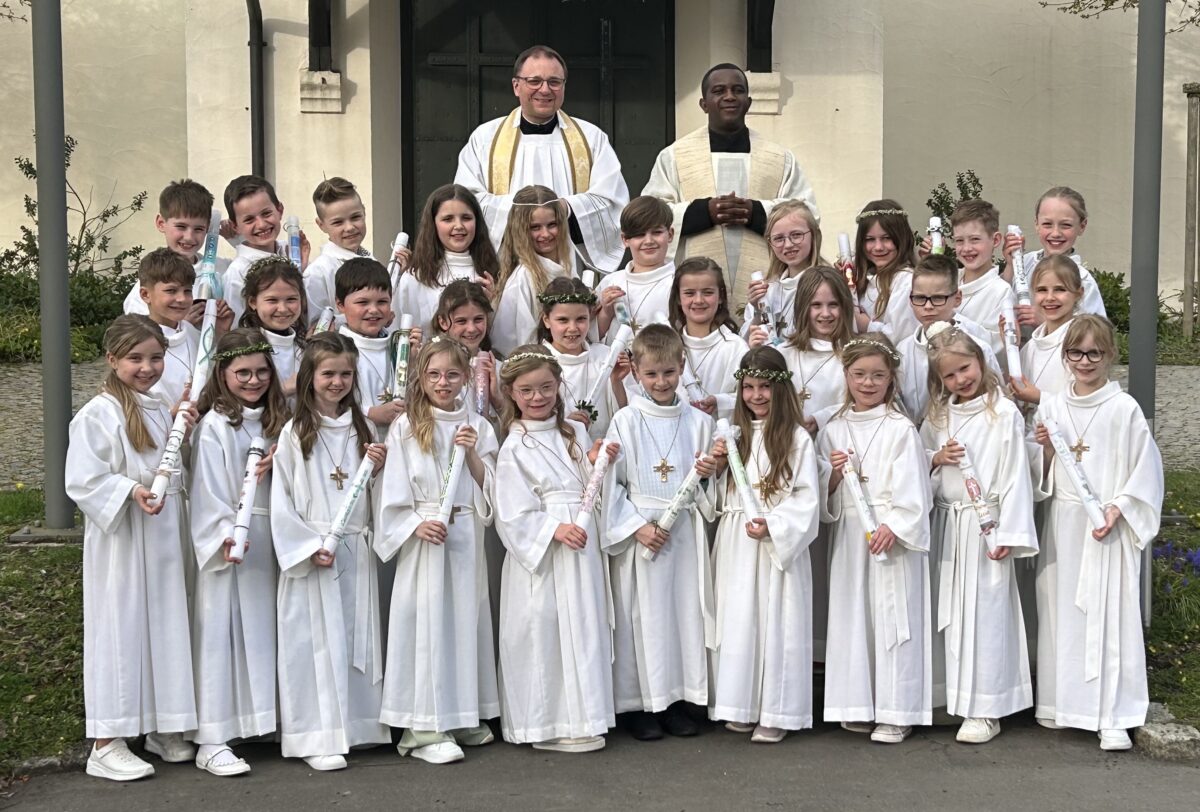 Aufgrund der knapp dreißig Kommunionkinder wurden die kirchlichen Feiern des Weißen Sonntags auf Samstag und Sonntag aufgeteilt, um auch die Teilnahme aller Verwandten und Bekannten der Kommunionkinder bei genügend Platz in der Pfarrkirche zu ermöglichen. Pfarrer Markus Bruckner freute sich über die hohe Anzahl der Erstkommunikanten und feierte zusammen mit diesen jeweils die Heilige Messe verteilt auf zwei Tage. Der Gottesdienst wurde dabei jeweils musikalisch umrahmt vom beliebten Kinder- und Jugendchor “Bunte Töne”.