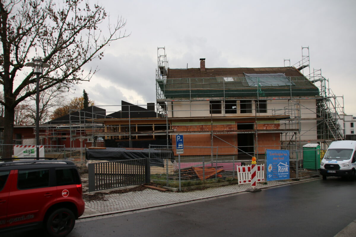 Der Anbau in Holzständer-Bauweise ist mittlerweile errichtet. Der Zimmerer kümmert sich gerade um die Sanierung des Dachstuhls des ehemaligen Schwesternwohnheims. Eine Untersuchung der Fassadenverkleidung hat ergeben, dass diese asbesthaltig ist.