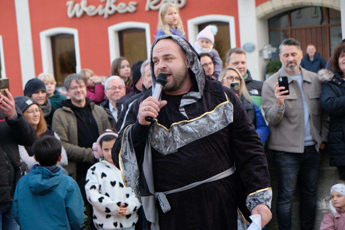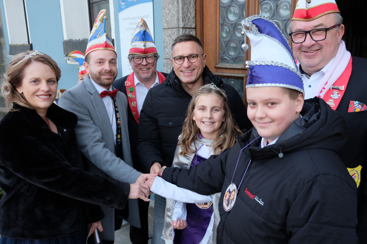 Prompt bekamen die Hoheiten mit Blick auf das Faschingsmotto „In der Welt der Sagen und Märchen“ Unterstützung von Zauberer SchipPix. „Rückst du nicht die Kasse raus, ist es mit dir aus“, hieß die Forderung an das Stadtoberhaupt, um auch dem Stadtrat zu drohen: „Der Stadtrat versetzt demnächst keine Berge, denn die enden als verzauberte Eschenbacher Zwerge“. Gleichzeitig verkündete der Zauberer, untermalt mit Harry Potters Titelmusik, das Erscheinen eines Kinderprinzenpaares per Zauberstab. Doch erst beim 3. Versuch glückte die Macht der Zauberkraft. Engelsgleich erschienen, vom Beifall der Narrengemeinde begleitet, Anni I. und Samuel I. (Anni Welser und Samuel Knechtel) auf der Rathaustreppe.