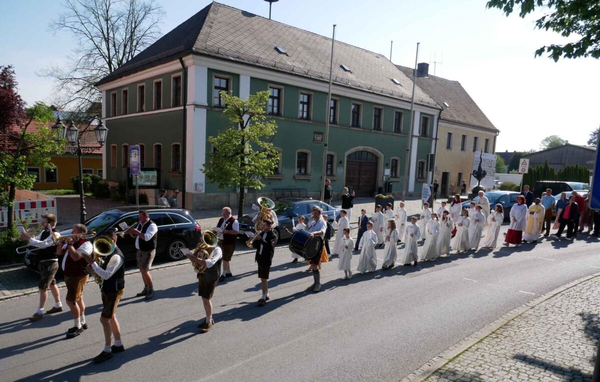 Am Sonntag versammelten sich 19 Erstkommunikanten mit ihren Eltern an der Schule und zogen mit musikalischer Begleitung der “Werkstattmusikanten” mit Pfarrer Erwin Bauer und Kaplan Basil zusammen mit den Ministrantinnen und Ministranten zur Pfarrkirche “Mariä Himmelfahrt”. Die Kinder strahlten mit der Sonne um die Wette und freuten sich auf den besonderen Festtag. Der Kirchenzug wurde von Organistin Martina Brenner und Sängerin Anna-Lena Klug mit dem Mottolied “Du bist bei mir alle Tage – Du gehst mit” empfangen.