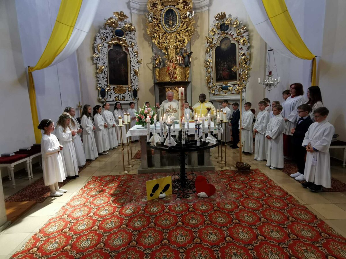 “Gott sehnt sich nach dem Menschen, schließt sozusagen mit dir einen Bund und schenkt sich in der Erstkommunion im Brot selbst.” Zur Erneuerung des Taufversprechens und dem erstmaligen Empfang der heiligen Kommunion versammelten sich die Kinder um den Altar. “Ihr seid zum Empfang der Heiligen Kommunion erstmals zum Tisch des Herrn eingeladen.”