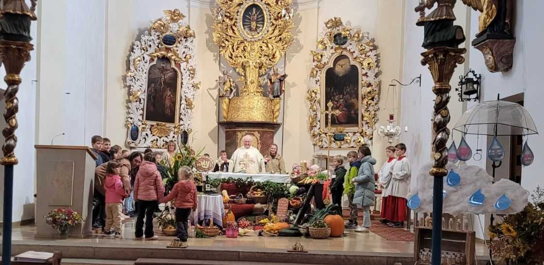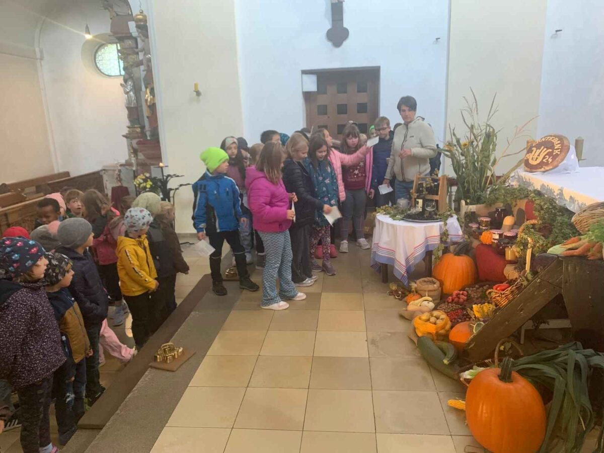Am 6. Oktober wurden in der katholischen Kirche zwei Gottesdienste gefeiert. Der Kirchenchor, begleitet von Organistin Martina Brenner, sorgte für die musikalische Umrahmung mit Lob- und Dankliedern. Kinder versammelten sich um den Altar, um für die gute Ernte zu danken, und baten die Menschen, sorgsam und wertschätzend mit den natürlichen Ressourcen umzugehen. Pfarrer Erwin Bauer und Kaplan Basil segneten die mitgebrachten Speisen und Erntedankkörbchen der Kinder.