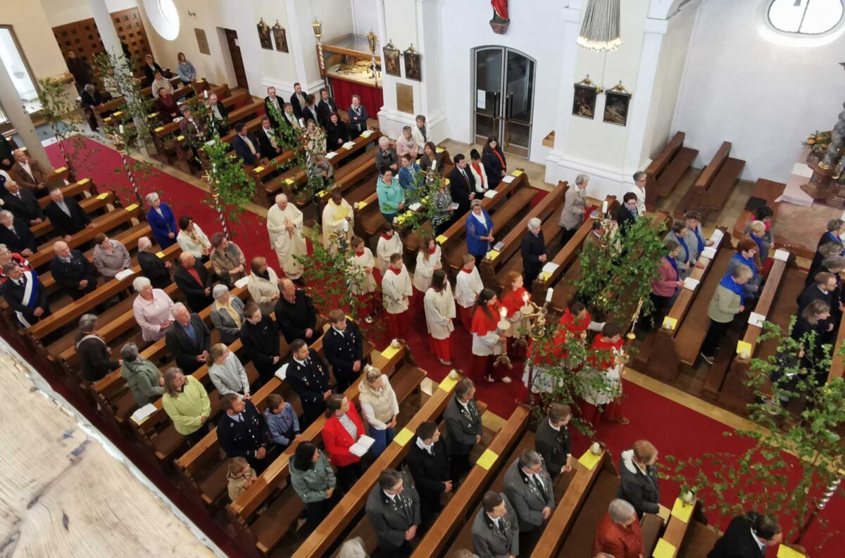 Die beispielhafte Glaubensdemonstration zeigte sich in der Anzahl der teilnehmenden Pfarrangehörigen. Der Frauenbund vereinte sich mit blauen Schals, die Markträte versammelten sich um zweiten Bürgermeister Thomas Kleber und die kirchlichen Organisationen mit den Kirchen-/Pfarrgemeinderäte um Kirchenpflegerin Nicola Hummer. In der festlich mit gelbweißen Dekobändern und weißen Papiertauben geschmückten Pfarrkirche erinnerte Pfarrer Erwin Bauer an den Ursprung der Prozessionen vor über 800 Jahren.