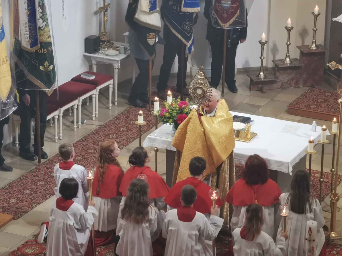Der Kirchenchor und die Bläser der Eslarner Blasmusik umrahmten unter der Leitung von Organistin Martina Brenner die Festmesse und die Prozession, die aufgrund der schlechten Witterung in die Pfarrkirche verlegt wurde. An den vier geschmückten Seitenaltären spendete Pfarrer Bauer und Pfarrvikar Basil Bazir mit der Monstranz den Segen in alle Himmelsrichtungen, für die Bevölkerung, den Ort, die Flur und aktuell für den Frieden.