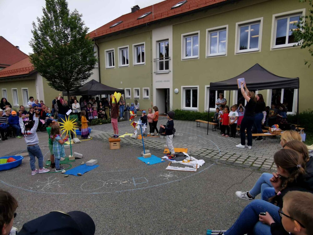 Ein Highlight bildete die Aufführung „Vier Jahreszeiten“ durch die Kinder der katholischen Kindertageseinrichtung in der für den Verkehr gesperrten Poststraße. Nach einer herzlichen Begrüßung durch Kindergartenleiterin Ramona Zangl sangen die Eisbären- und Zwergenkinder zusammen mit den pädagogischen Fachkräften das Lied „Januar, Februar, März, April, die Jahresuhr steht niemals still“. Im Kreis stellten sie mit Symbolen und Spielen die vier Jahreszeiten dar. Der Frühling wurde durch blühende Blumen und die erwachende Tierwelt symbolisiert, der Sommer durch warme Badetage und leckeres Eis. „Die Sommerkinder freuen sich auf Hula-Hoop mit braungebranntem Bauch und wollen Spielen irgendwo am Strand“, sangen die Kinder.