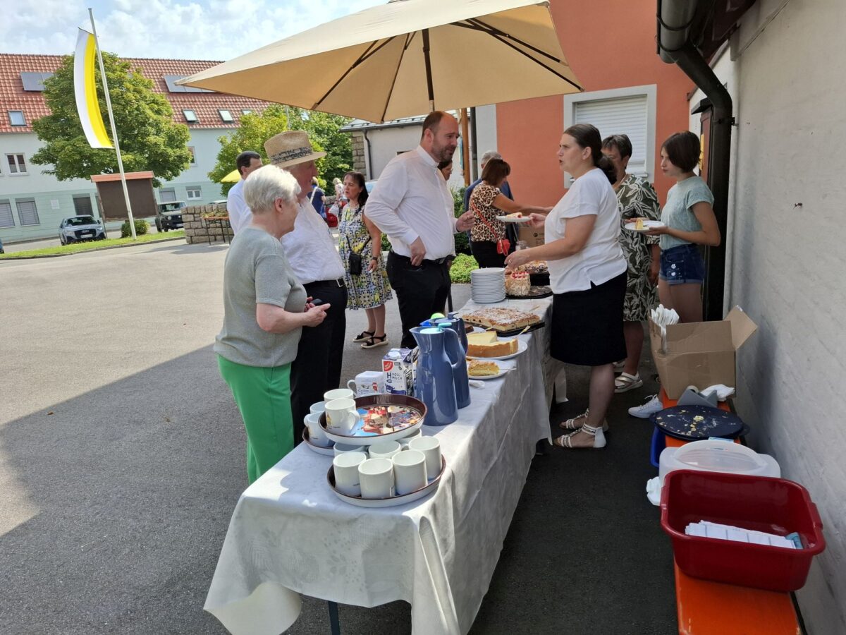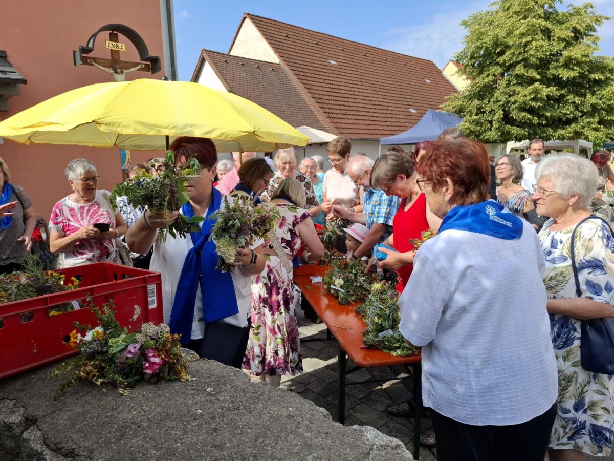 Bereits Tradition hat im Anschluss der Messfeier die Kräuterweihe. Die Vorstandschaft vom Katholischen Frauenbund hatte 150 Kräuterbüschel gebunden und bot diese vor der Kirche zum Kauf an. Die Beliebtheit der Büschel zeigte der Andrang an Kaufinteressenten. Gleichzeitig bot die Kolpingsfamilie neben der Pfarrkirche unter den Linden zum Frühschoppen zu Weißwürsten knusprige Brezen an. Nach dem Motto „nach der Mess die Mass“ gabs dazu flüssige Kost. Zudem reichten die Kolpingschwestern bei herrlichem Sommerwetter zu Kaffee leckeren Kuchen.