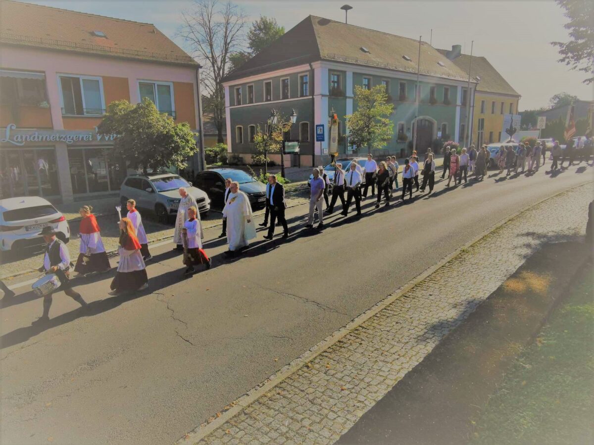 Zum Patrozinium begleitete die Blaskapelle mit Musikern aus verschiedenen Musikgruppen die Organisationen und Vereine, darunter Pfarrer Erwin Bauer mit Diakon Andreas Dieterle und Zweiter Bürgermeister Thomas Kleber mit dem Dritten Bürgermeister Bernd Reil und einigen Markträten in einem Kirchenzug musikalisch zur Kirche.