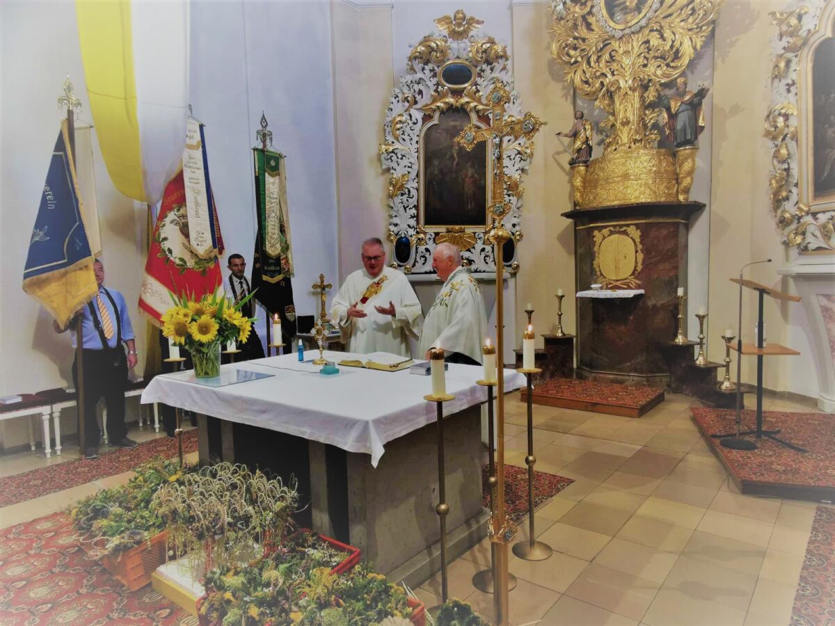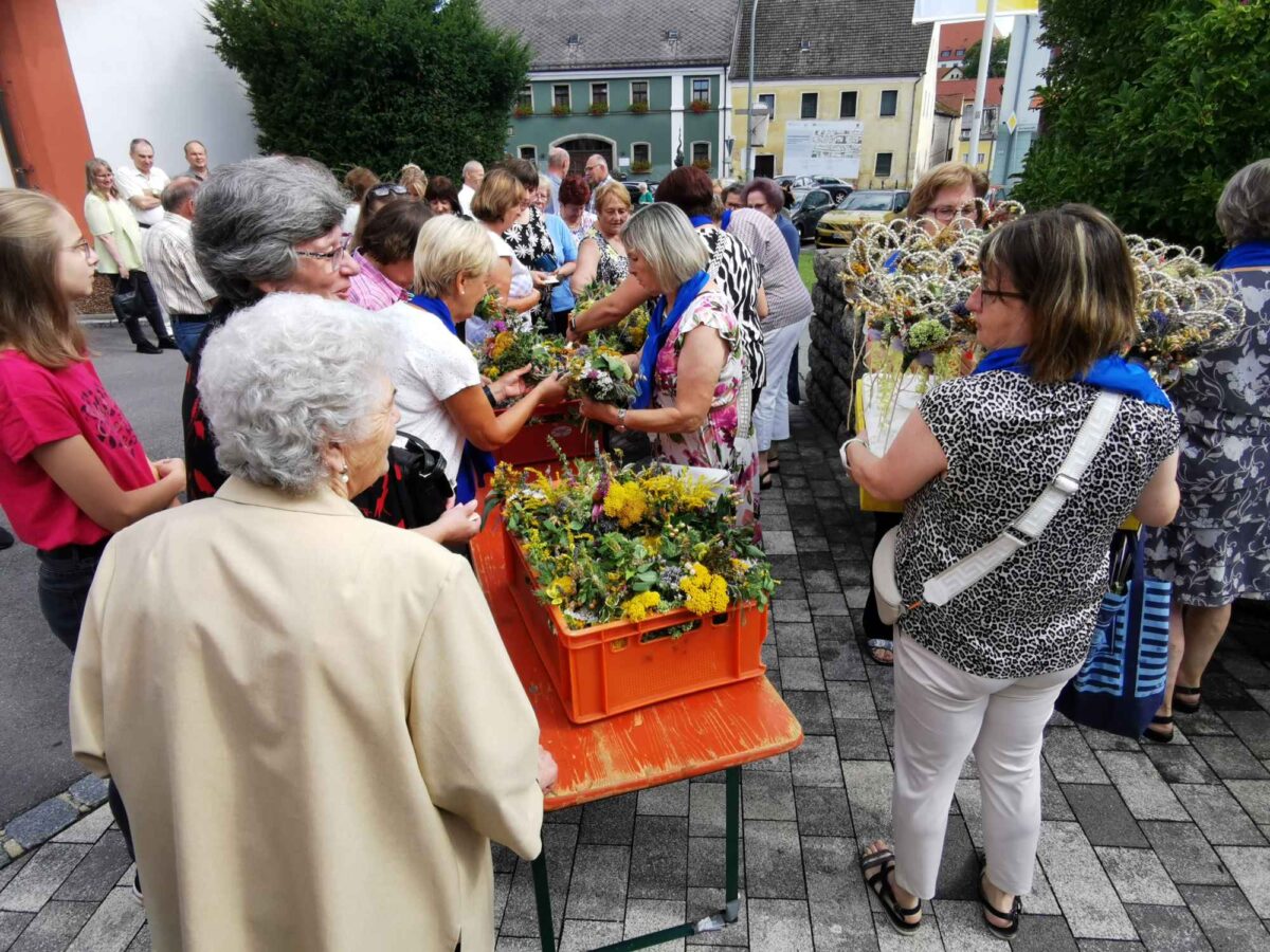 Im Anschluss bot der katholische Frauenbund vor der Kirche die aus Blumen und Kräutern gebundenen und in der Messfeier gesegneten Kräuterbüschel und gebastelte Herzen zum Kauf an. Die Vorstandschaft hatte sich am Vortag in einem Bastelabend bestens auf die vielen Käufer eingestellt.