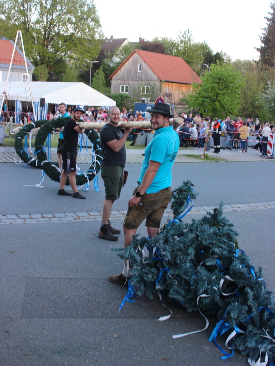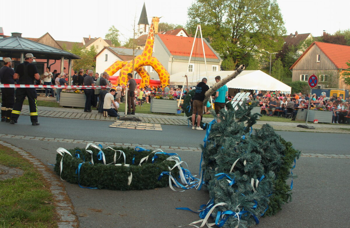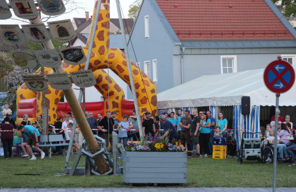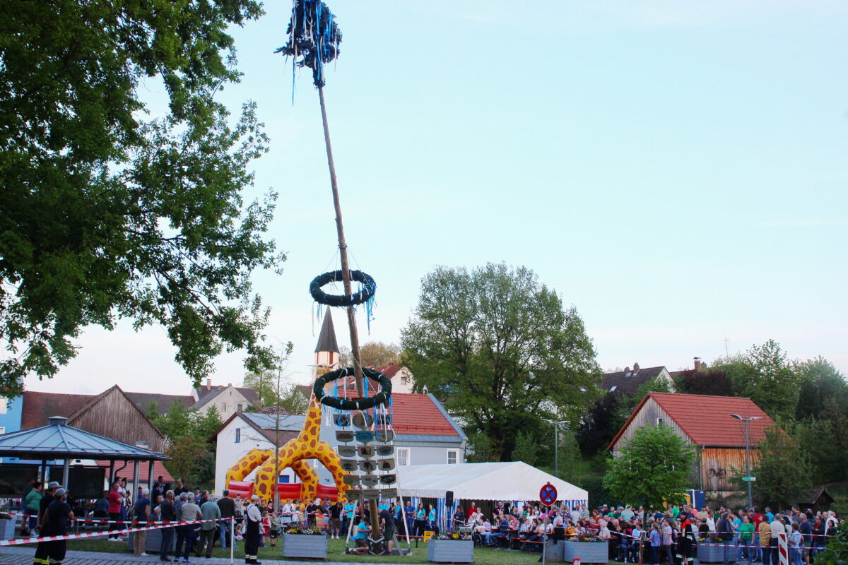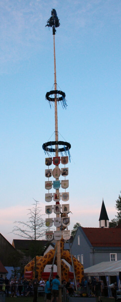 Ein Highlight war einmal mehr die ausgeklügelte Halterung und Aufbaumechanik des Maibaums, ein Meisterstück von Sepp Konrad. Selbst eine kleine Reparatur an der Baumspitze, die kurzzeitig für Verzögerung sorgte, konnte dem Fest keinen Abbruch tun. Mit koordinierter Anstrengung stand der Maibaum schließlich, 22 Meter hoch, pünktlich um 20.10 Uhr aufrecht und bereit, bewundert zu werden.