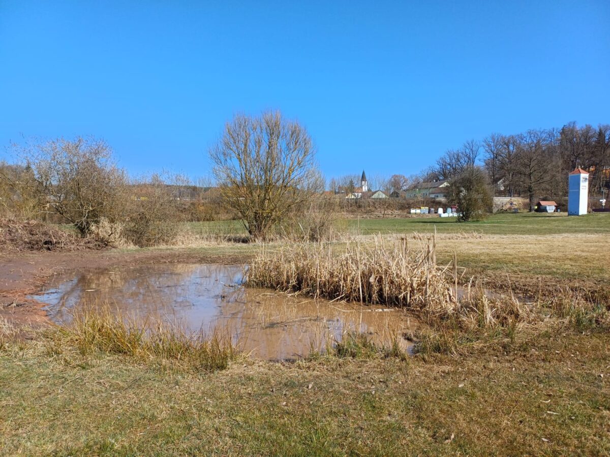 Was könnte helfen? „Ich habe mit Lindas-Wirt Robert Hammer vereinbart, dass wir an diesem Wochenende ein weithin sichtbares optisches Zeichen setzen, hochklettern und die Horst-Umgebung mit weißer Farbe streichen“, kündigt Adolf Küblböck in Abstimmung mit der Hausherrin Linda Hammer an. Flankierend zum Tünchen des Daches wurde auch im Umfeld des Flusslaufes gearbeitet. Küblböck kündigte an: „Um den Storch den Etzenrichter Horst schmackhaft zu machen, haben wie das Storchen-Biotop in der Aue entlandet und somit aktiviert.“ Am Tag nach dem Freischnitt der Fläche rückte der Bagger zum Schaffen eines Tümpels an.