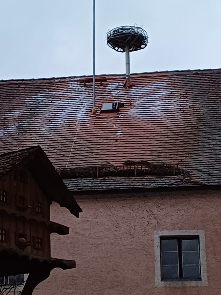 Von 1991 bis 2018 ein gewohntes Bild mitten in Etzenricht: Störche ziehen hoch auf dem First des von der Familie Hammer bewohnten Pfisterhof ihren Nachwuchs auf. Die Experten des LBV haben keine Erklärung für das Fernbleiben und wollen nun mit einem Anstrich einen Versuch starten, den 2008 sanierten Horst wieder mit Leben zu erfüllen.