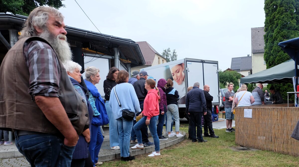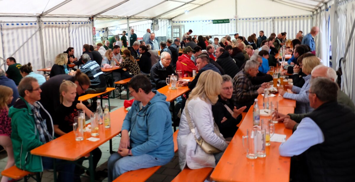 Waren es in den letzten Jahren die Sitzplätze im Außenbereich, die sofort belegt waren, zog es die Gäste heuer eher ins Festzelt, das dann auch schnell gefüllt war und Tische und Bänke von draußen geholt werden mussten, um die vielen Gäste unterzubringen. Es gab aber auch viele, die sich trauten draußen zu sitzen und denen es augenscheinlich nichts ausmachte, mal zwischendurch ein paar Regentropfen abzubekommen.