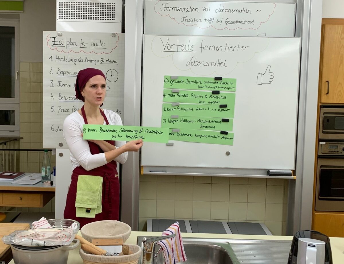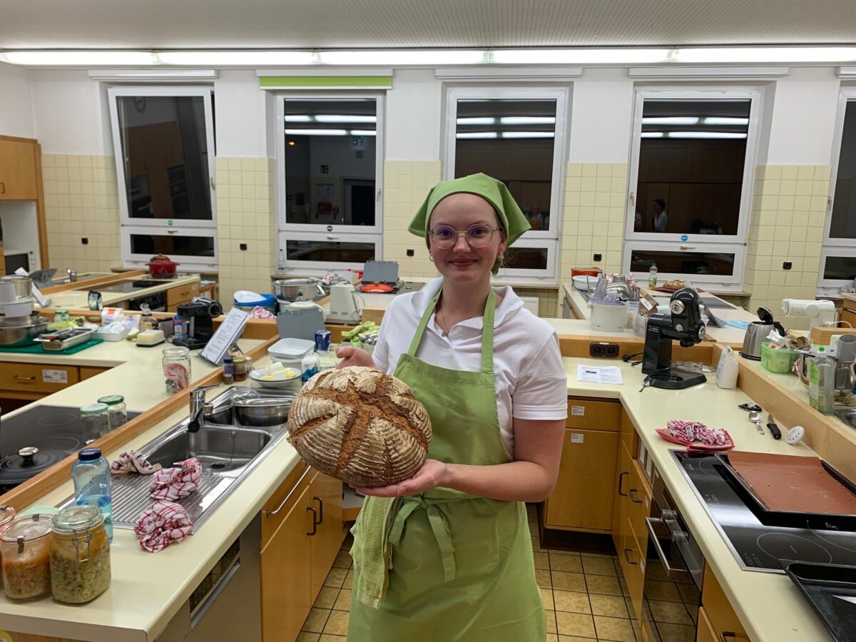 „Ich dachte, Brotbacken ist total die Wissenschaft und dass ich dafür keine Zeit hätte. Aber im Unterricht ging es echt fix!“, freut sich die Studierende Marie Bauer über ihr frisches, selbst gebackenes Sauerteigbrot. Im Wahlpflichtmodul Küchenpraxis an der Fachschule für Ernährung und Haushaltsführung (FEH) wurde es in dieser Stunde lebendig. Im Wahlpflichtmodul Küchenpraxis drehte sich alles um das Thema Fermentation. Fermentation ist eine uralte Methode, um Lebensmittel haltbar zu machen und deren Geschmack zu veredeln, und aktuell voll im Trend.