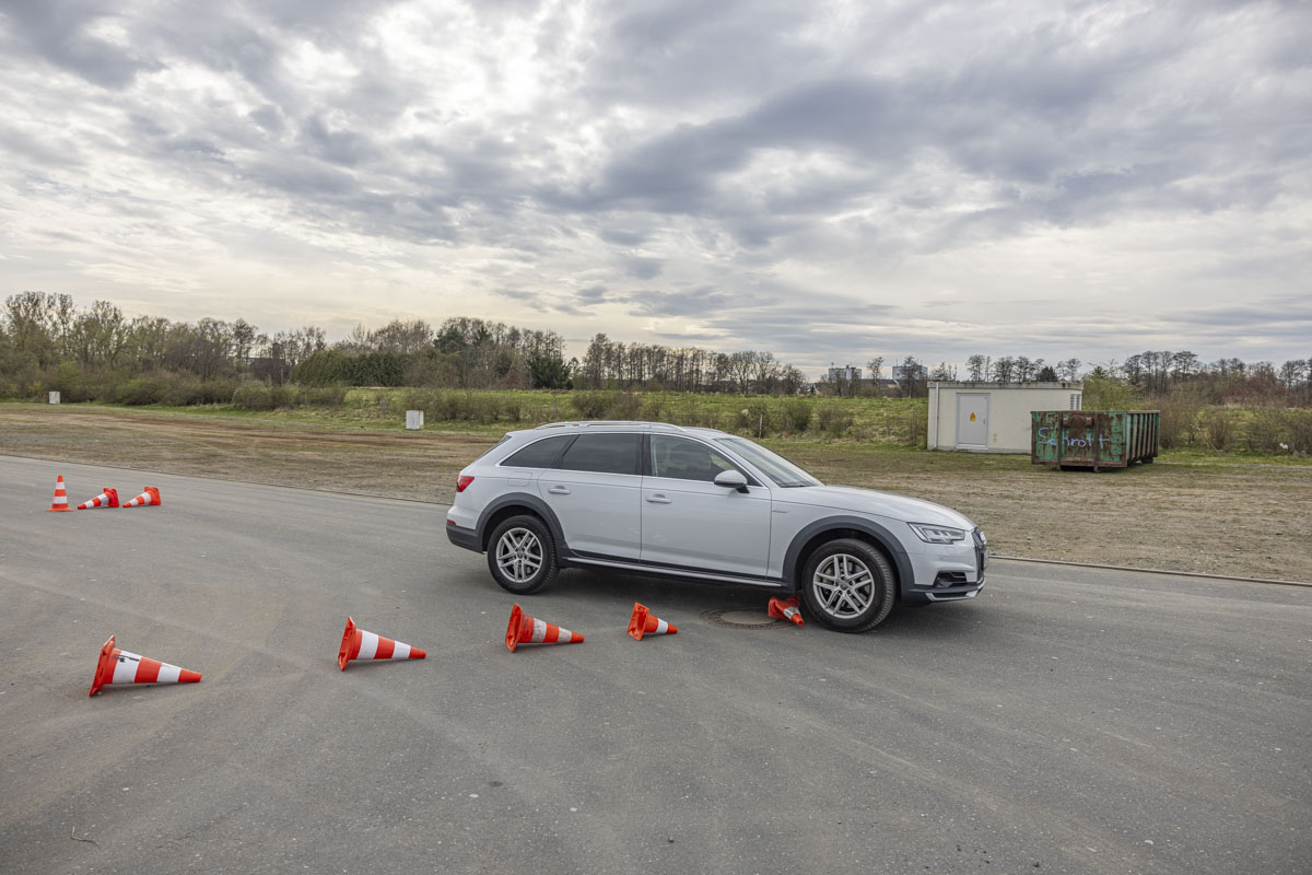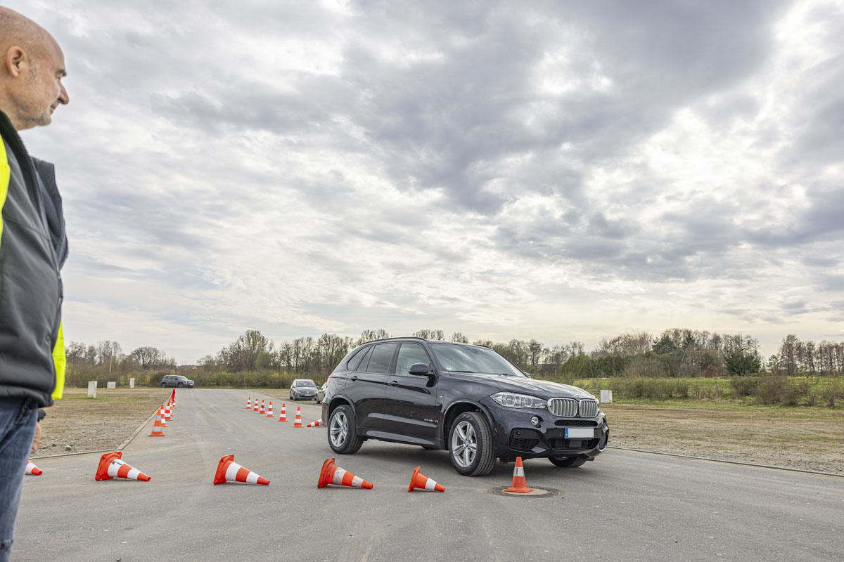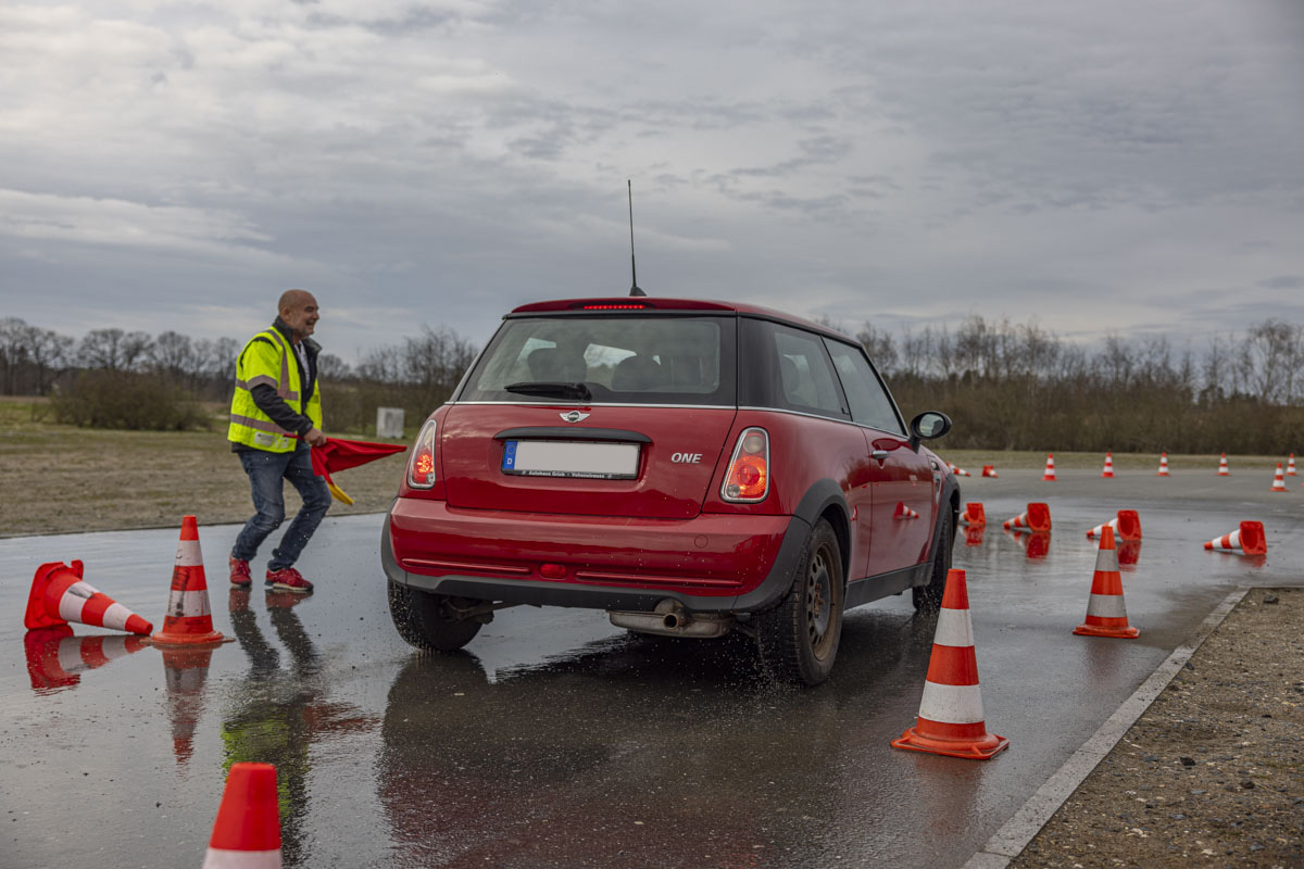 Nachdem die Sitzposition der Kursteilnehmer optimal angepasst war, durften sie erste Übungsrunden auf dem Slalom-Parcours bewältigen. Dabei zeigte sich schnell, dass mancher Senior schon mal gerne ordentlich Gummi gibt. Einige der Teilnehmer-Fahrzeuge waren mit über 500 PS und dicken V8-Motoren auch gewiss nicht unterdimensioniert. Die korrekte Sitzposition ist gerade bei Senioren besonders wichtig, weil die Bewegungseinschränkung im Alter zum Beispiel den Schulterblick erschweren.