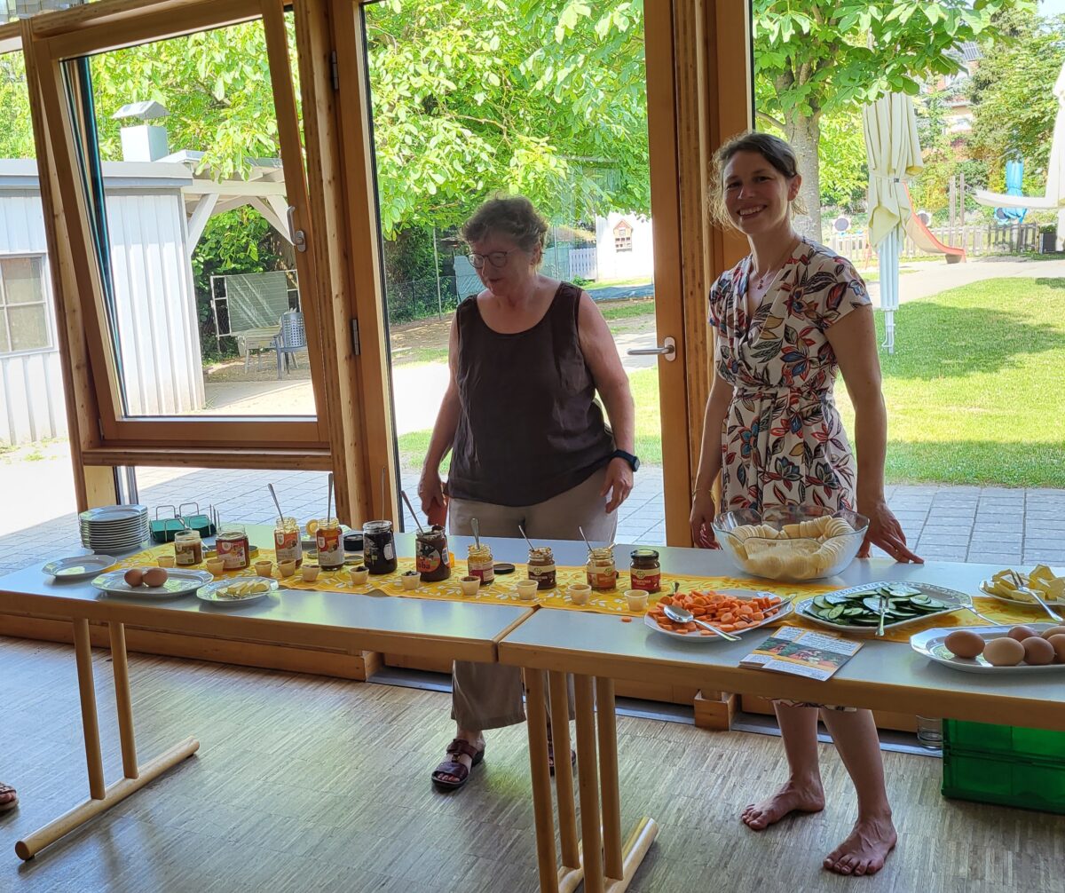 Trotz des heißen Wetters folgten knapp 30 Interessierte, zum Teil auch mit ihren Kindern, der Einladung und erfreuten sich an dem abwechslungsreichen Frühstück: Zu probieren gab es neben Semmeln, Brezen und Brot aus einer regionalen Bäckerei verschiedene faire Aufstriche wie zweierlei Schokoaufstriche, zwei verschiedene Honigvariationen sowie süße, scharfe und deftige Gemüseaufstriche.