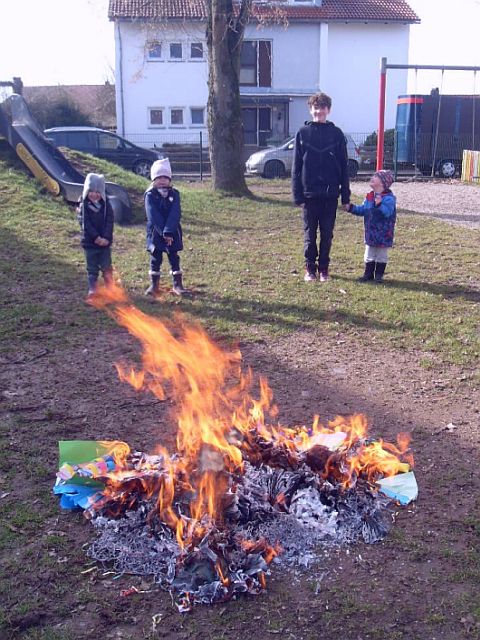 Während der Andacht weihte der Pfarrer die Asche, die aus verbrannten Palmzweigen besteht. Anschließend legte er allen Anwesenden das Aschenkreuz auf. Im Anschluss wurde dann im Garten des Kinderhauses die Faschingsdekoration verbrannt. Mit diesem Ritual haben die Kinder den Fasching verabschiedet und die Fastenzeit begrüßt.