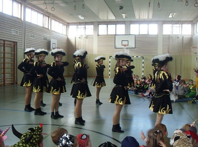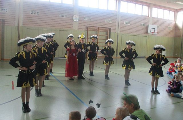 Auch die Mädchen der Pressather Jugendgarde warteten auf die Kinder. Sie zeigten verschiedene Formationstänze, ein Funkenmariechen bewies bei einer Solotanzeinlage ihr Können und das Kinderprinzenpaar verzauberte die Zuschauer mit einem gemeinsamen Tanz.