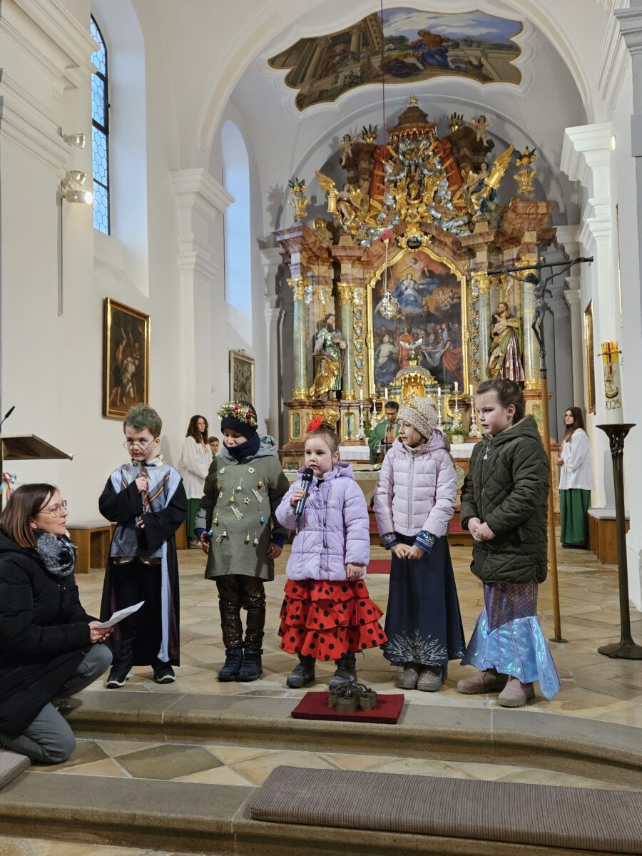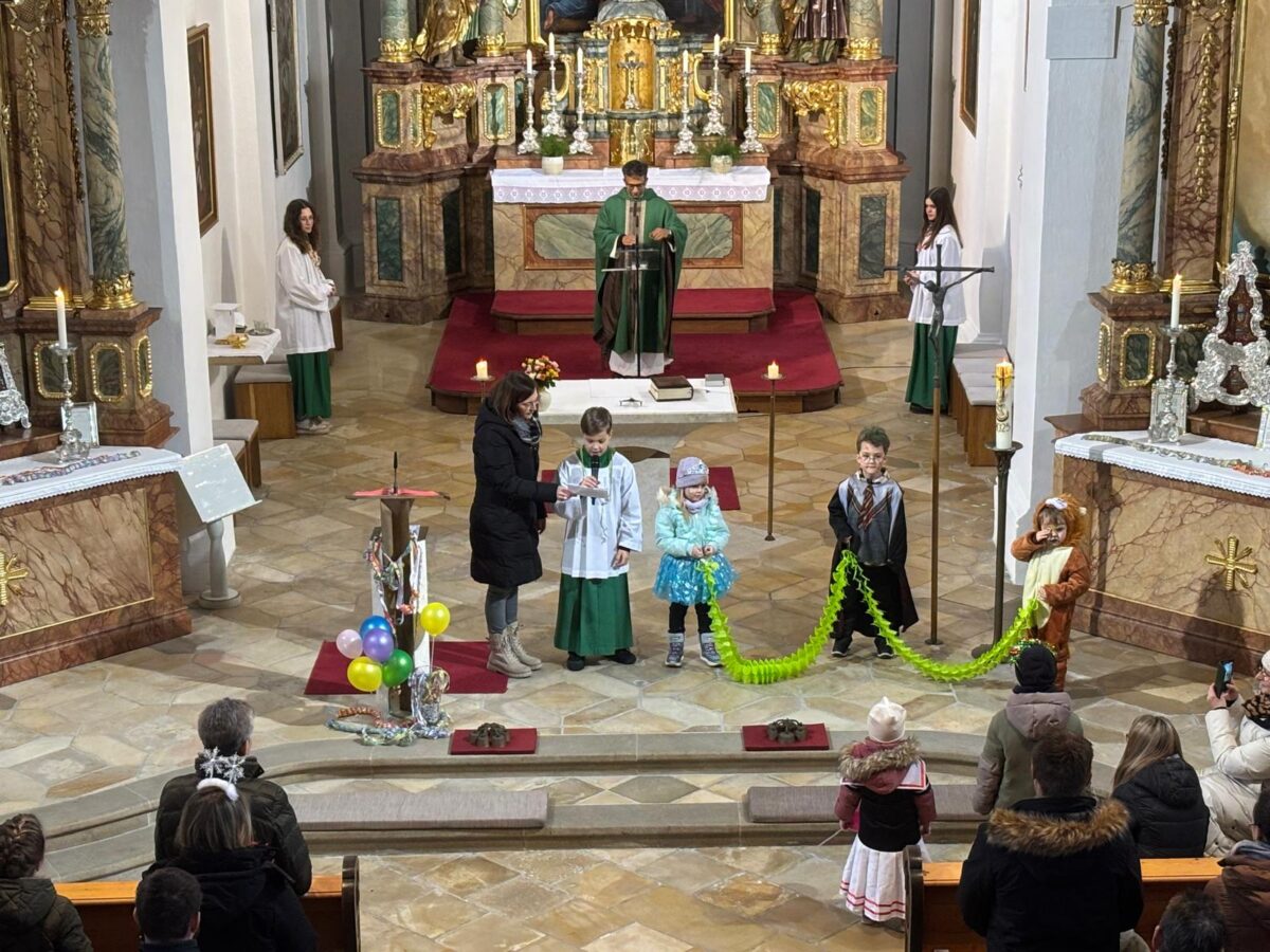 Pater Joseph nannte Zitate und Beispiele unter anderem von Charly Chaplin, Charlie Rivel, Elisabeth von Thüringen oder Don Bosco, die mit ihrem Leben bezeugt hätten, dass das Leben trotz aller Herausforderungen immer lebenswert sei. Fröhlich sein, Gutes tun und die Spatzen pfeifen lassen – ein Lachen könne Brücken bauen von Mensch zu Mensch. Auch die Geschichte eines Klostermönches, der statt des gemeinsamen Gebetes mit seinen Mitbrüdern lieber tanzend und singend in einer abgeschiedenen Kapelle Gott lobte, zeigte: Man kann Gott mit Leib und Seele ehren, und Freude ist eine Form des Gebets. Begeistert beteten die kleinen Maschkerer das Vaterunser mit bewegten Gesten rund um den Altar.