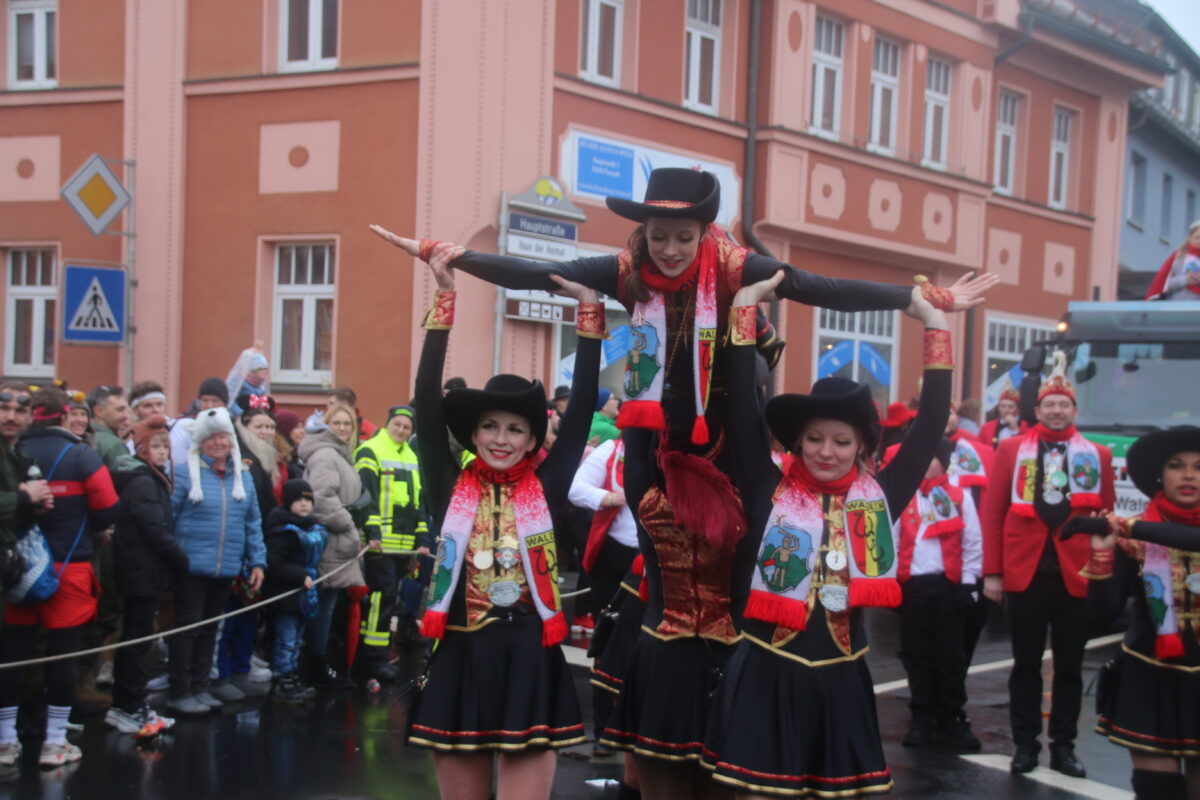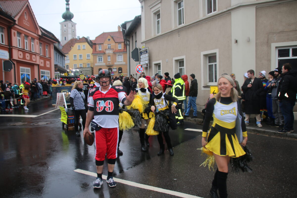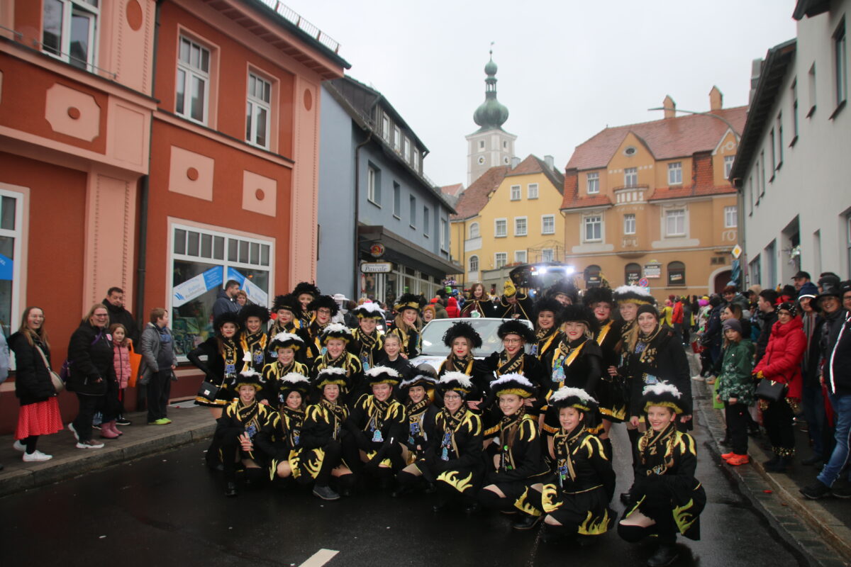 33 Gruppen und Wägen starteten dann von der Avia-Tankstelle Hautmann in die Innenstadt. Natürlich führten die Lokalmatadore vom PFV den Zug an – Dabei musste Präsident Martin Reis wegen vieler Krankheitsfälle noch auf die Schnelle improvisieren: Zum Beispiel schlüpfte Trainerin Kathrin Fritsch in das Funkenmariechen-Kostüm, da Marina Tafelmeyer absagen musste.