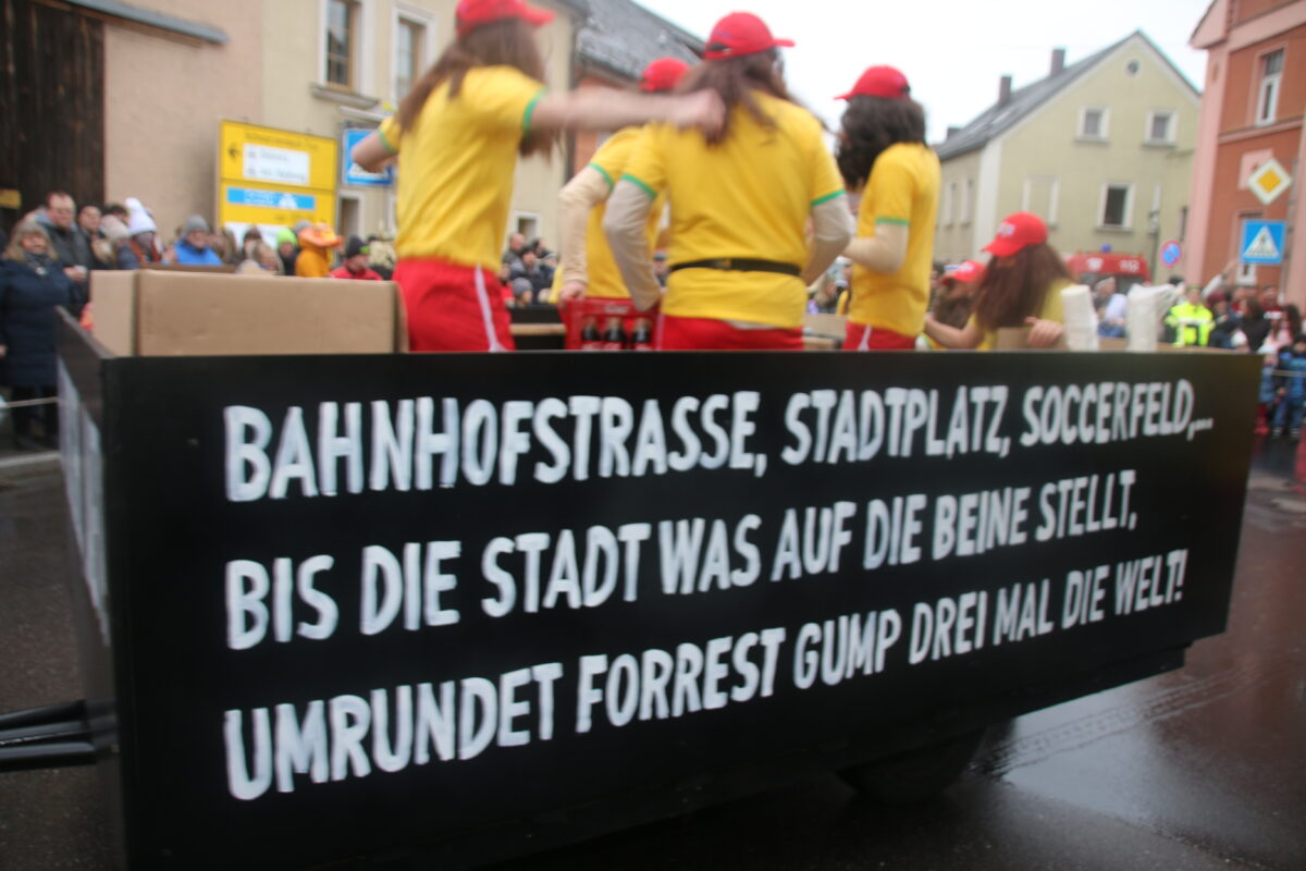 Am Zug selbst gab es jede Menge politische Botschaften zum Lokalgeschehen. Der Burschenverein hatte sich als Forrest Gump verkleidet, der im Film mehrere Male durch die USA läuft. Dazu kritisierten die Burschen auf einer Tafel die lange Dauer bis Maßnahmen in Pressath umgesetzt werden: “Bahnhofstraße, Stadtplatz, Soccerfeld,… Bis die Stadt was auf die Beine stellt, umrundet Forrest Gump drei mal die Welt!”