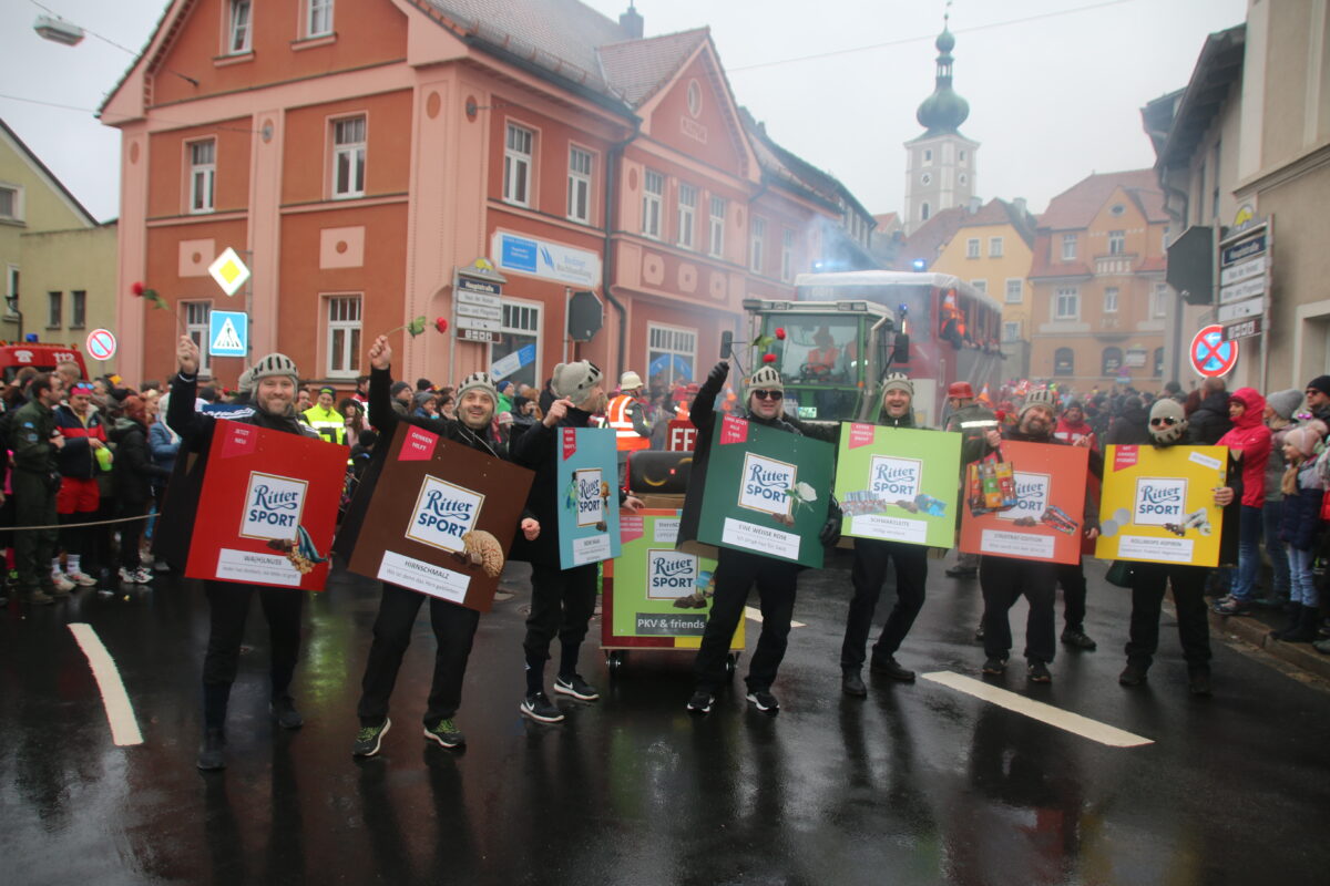 Der “Pressather Karnevals Verein & Friends” ist bekannt für kreative Motive – Dieses Mal kamen sie passend zum Motto des Zugs als Ritter-Sport-Schokolade. Unterschiedliche Motive pointierten das Stadtgeschehen: “Stadtrat-Edition – Man weiß nie, wer drin ist” kommentierte die hohe Fluktuation unter den Pressather Stadträten. “Schwarzleite – Völlig verplant” nahm Anstoß am Planungsverfahren für das neue Baugebiet.