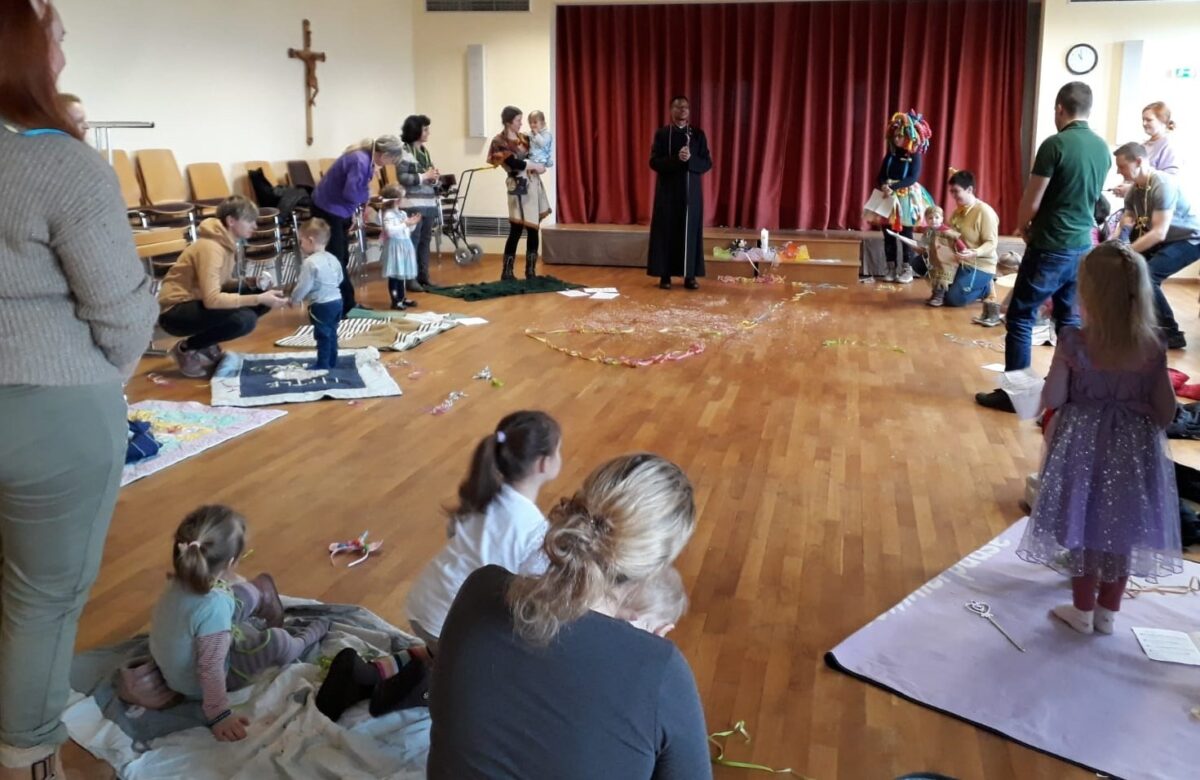Zu ihrem ersten Kleinkindergottesdienst im neuen Kalenderjahr kamen wieder über zehn Familien in das Pfarrheim der Herz-Jesu-Pfarrgemeinde. Das Motto der kleinen Andacht lautete dieses Mal “Eine Luftschlange für Flecki”. Auch Kaplan Justin nahm sich hierfür wieder Zeit.
