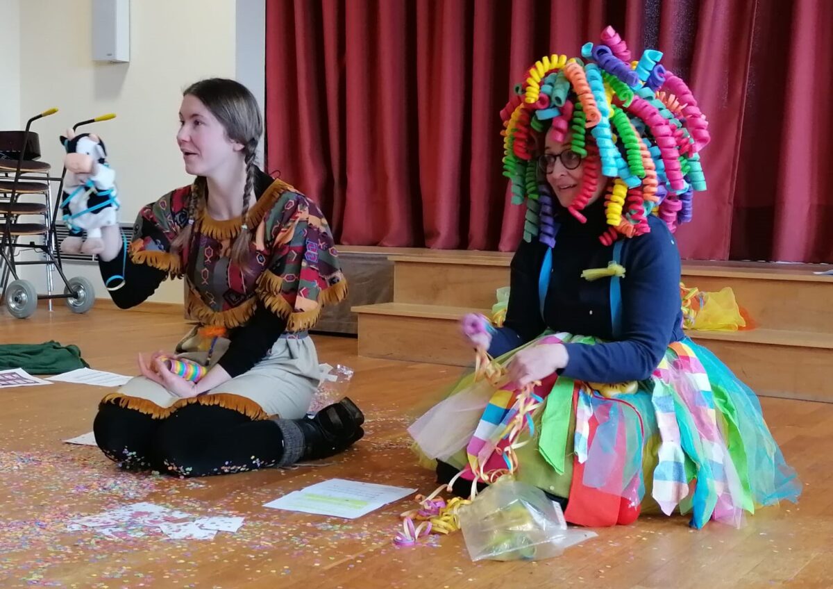 Nach einem gemeinsamen Anfangslied war das Maskottchen „Flecki“ wieder voll im Einsatz und sprach mit den Kindern über Fasching. Die Kinder durften dabei erzählen, als was sie sich verkleidet hatten und mit den vor ihnen liegenden Puzzleteilen wurde gemeinsam ein lustiger Clown gepuzzelt.