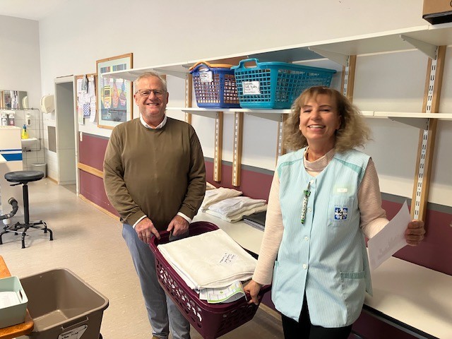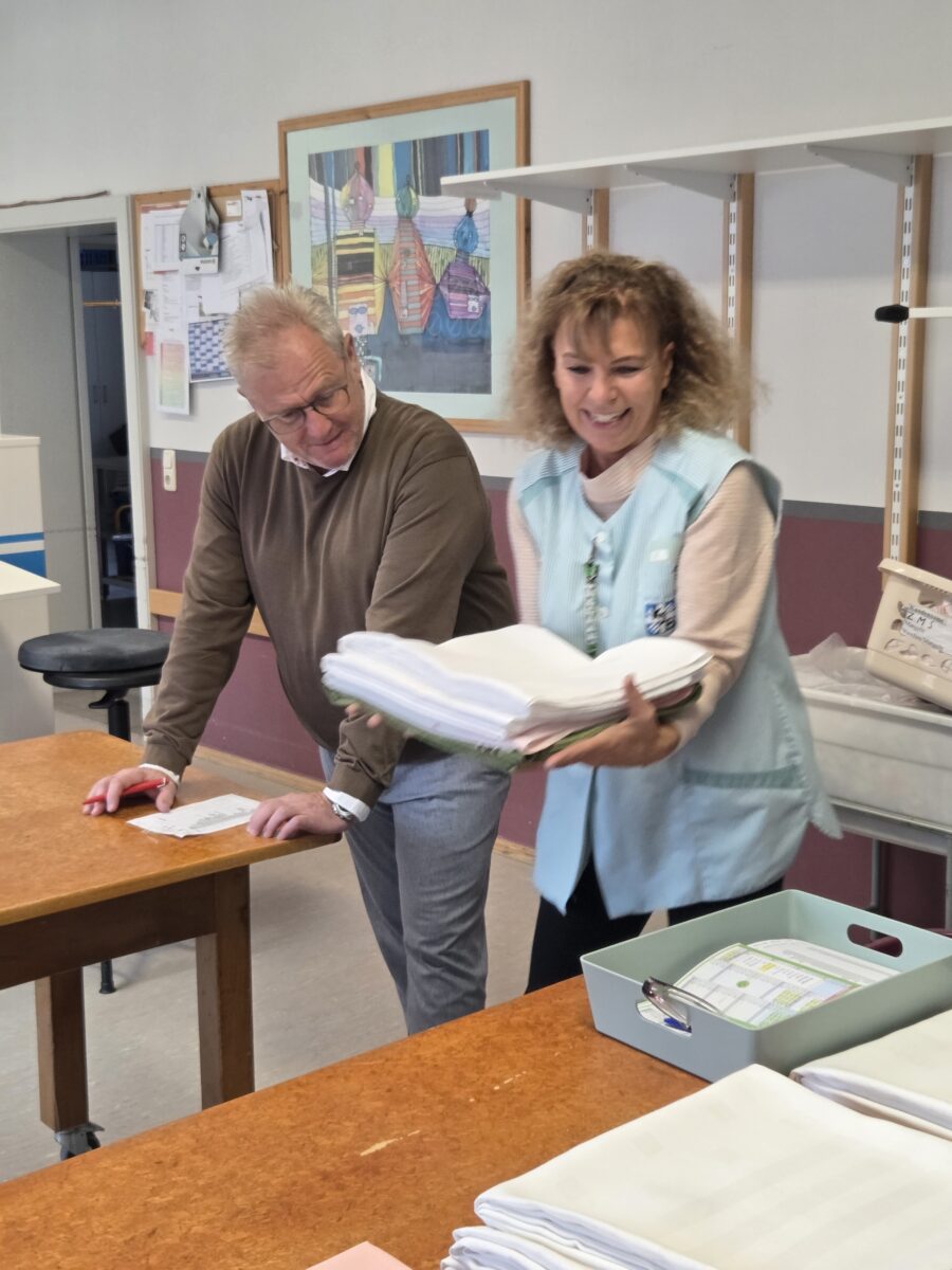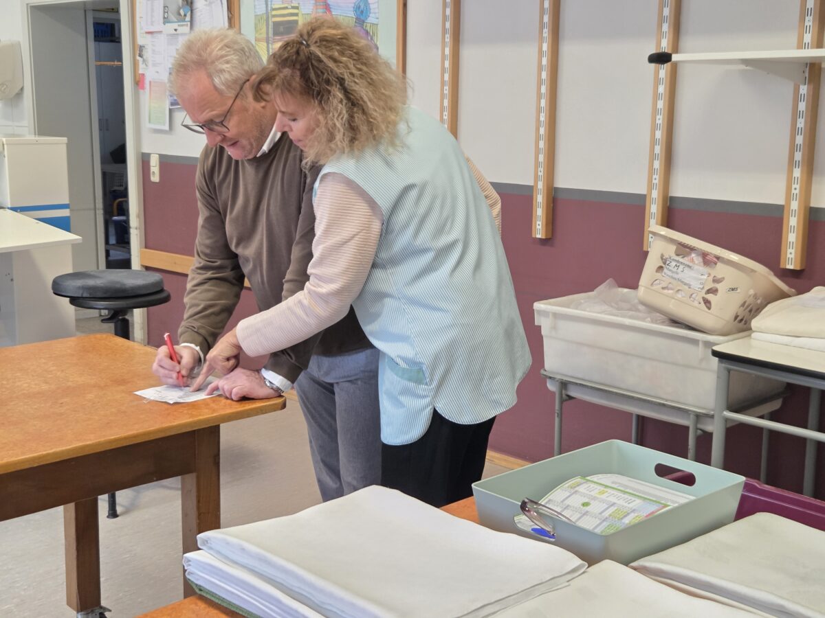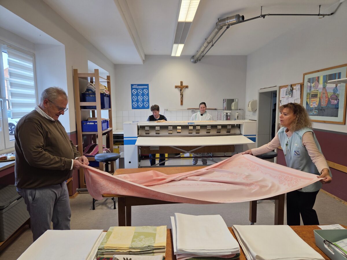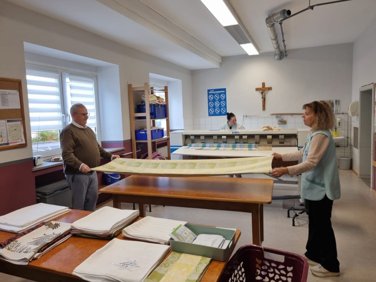Der Besuch blieb auch in anderen Ausbildungsbereichen des Hauses nicht unbemerkt. Spontan versprach Feller, bei nächster Gelegenheit auch in der Wäscherei tatkräftig mitzuhelfen – ein Versprechen, das er nun einlöste. Vergangene Woche war es so weit: Einen Vormittag lang unterstützte der Oberbürgermeister das Team der Wäscherei.