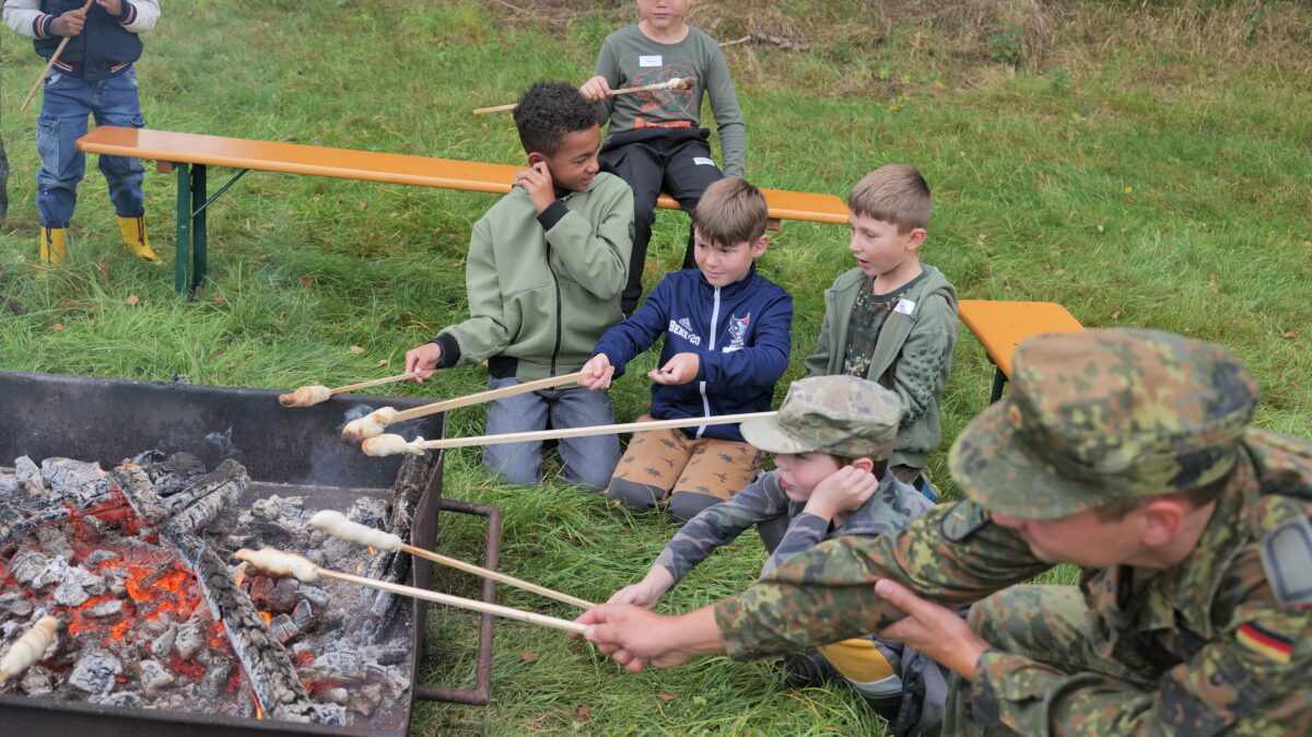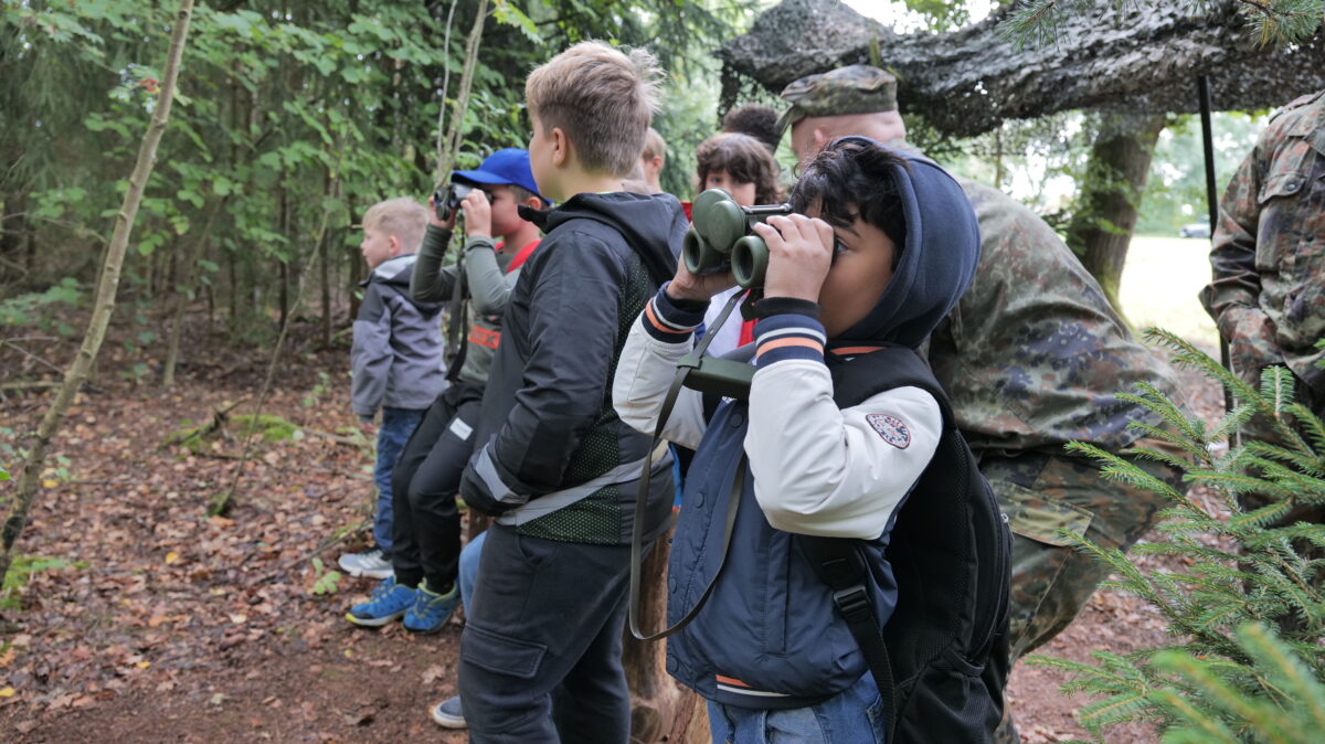 Die Verpflegungsgruppe, die sonst im Einsatz und auf Übungen die Feldverpflegung für ihre Kameraden zubereitet, zeigte außerdem, wie sich Soldaten mit sogenannten Einpersonenpackungen – kurz EPA – ernähren, wenn über mehrere Tage kein Nachschub möglich ist. Als Letztes wartete auf die Kinder eine herausfordernde Aufgabe: Mit Ferngläsern mussten sie unterschiedliche Dinge finden, die im Wald versteckt waren. Auch ein Soldat, der sich einmal ohne und einmal mit Tarnmitteln wie Schminke, Blättern und Zweigen im Wald versteckt hatte, musste gefunden werden. Nach dem abschließenden Mittagessen am Lagerfeuer verabschiedeten sich die 36 Abenteurer von den Soldatinnen und Soldaten des PzArtBtl 375 mit leuchtenden Augen und vielen Erlebnissen im Gepäck.