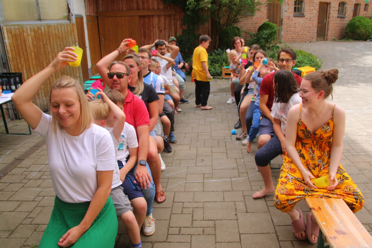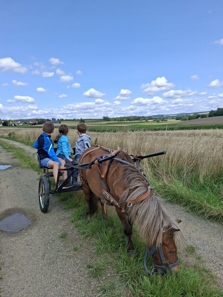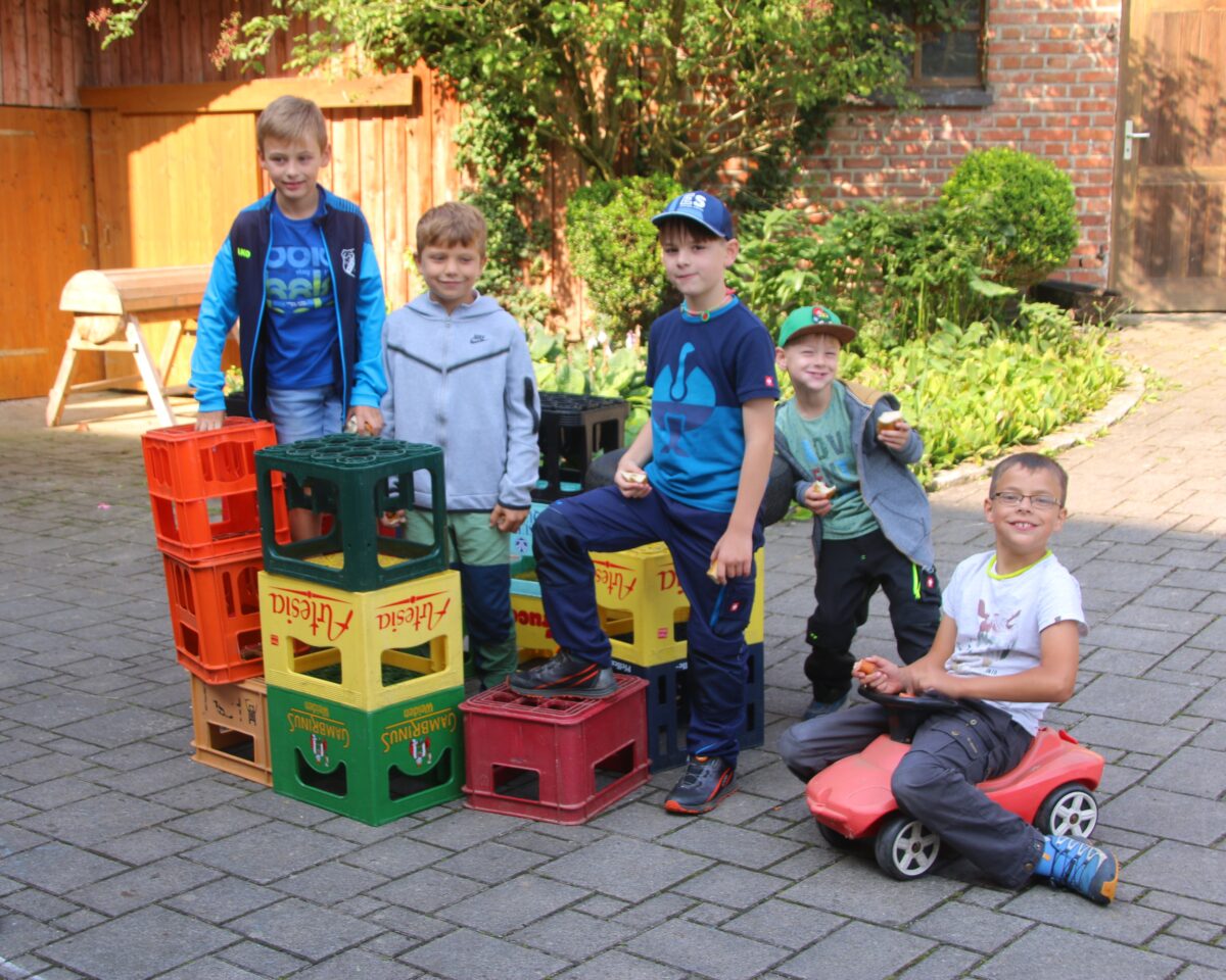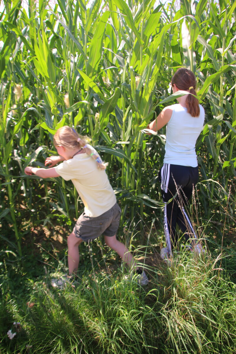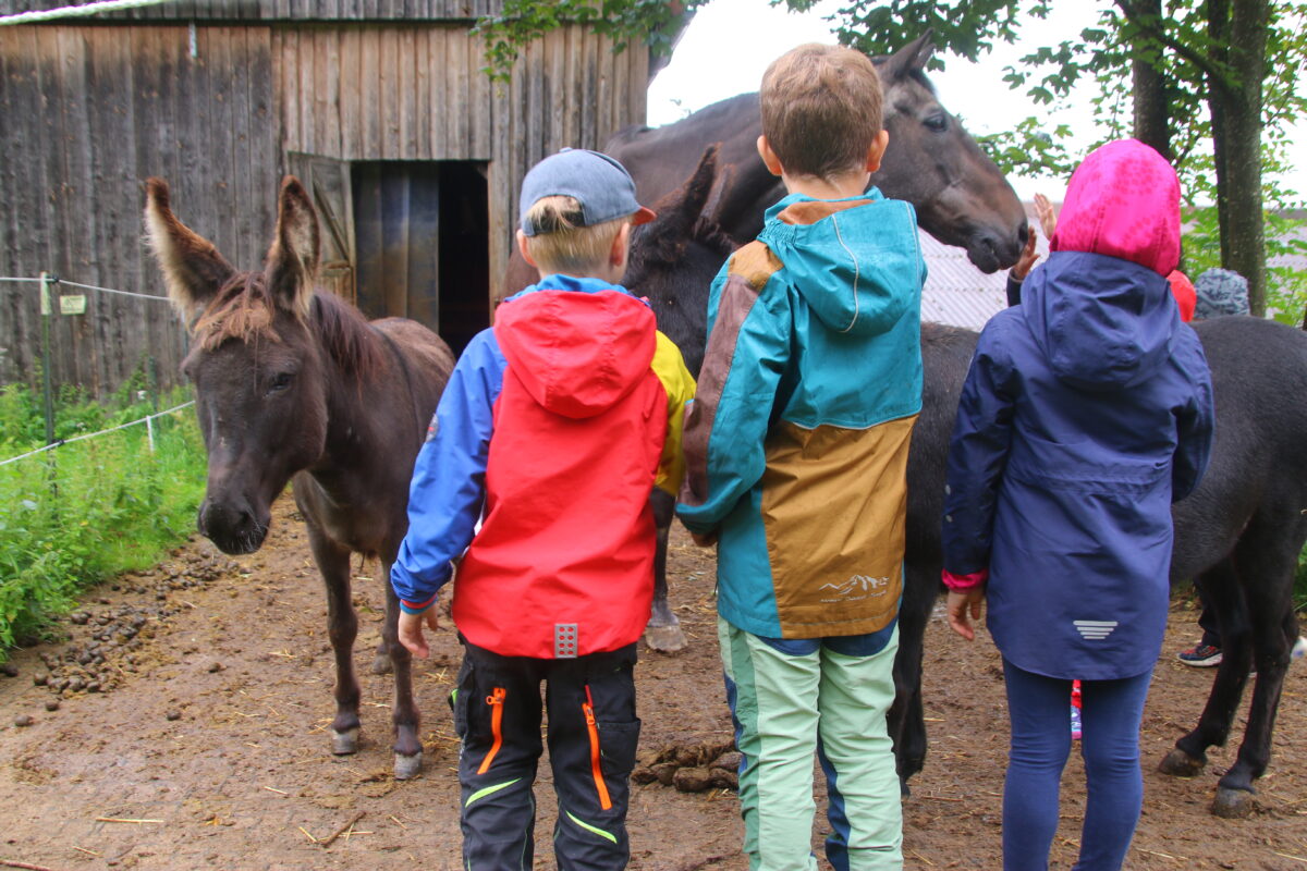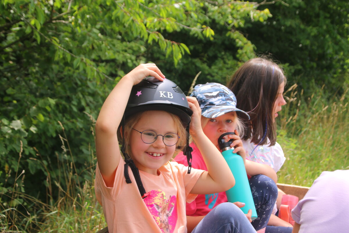 Den Kindern wurde einiges geboten: Ausfahrten mit dem Bulldog, erste Erfahrungen auf dem Rücken der Pferde, streicheln der Esel, sie nahmen auf dem Pony-Sulky Platz und entdeckten ein Maisfeld auf ganz besondere Weise – mittendurch! Auch eine Schatzsuche durch das Dorf durfte nicht fehlen. Während man am Anfang der Woche noch aufgrund des unsteten Wetters am Feuer Stockbrot machte, war am Abschlusstag eine Abkühlung nötig: Bei der Wasserschlacht gab es fröhliches Geschrei.