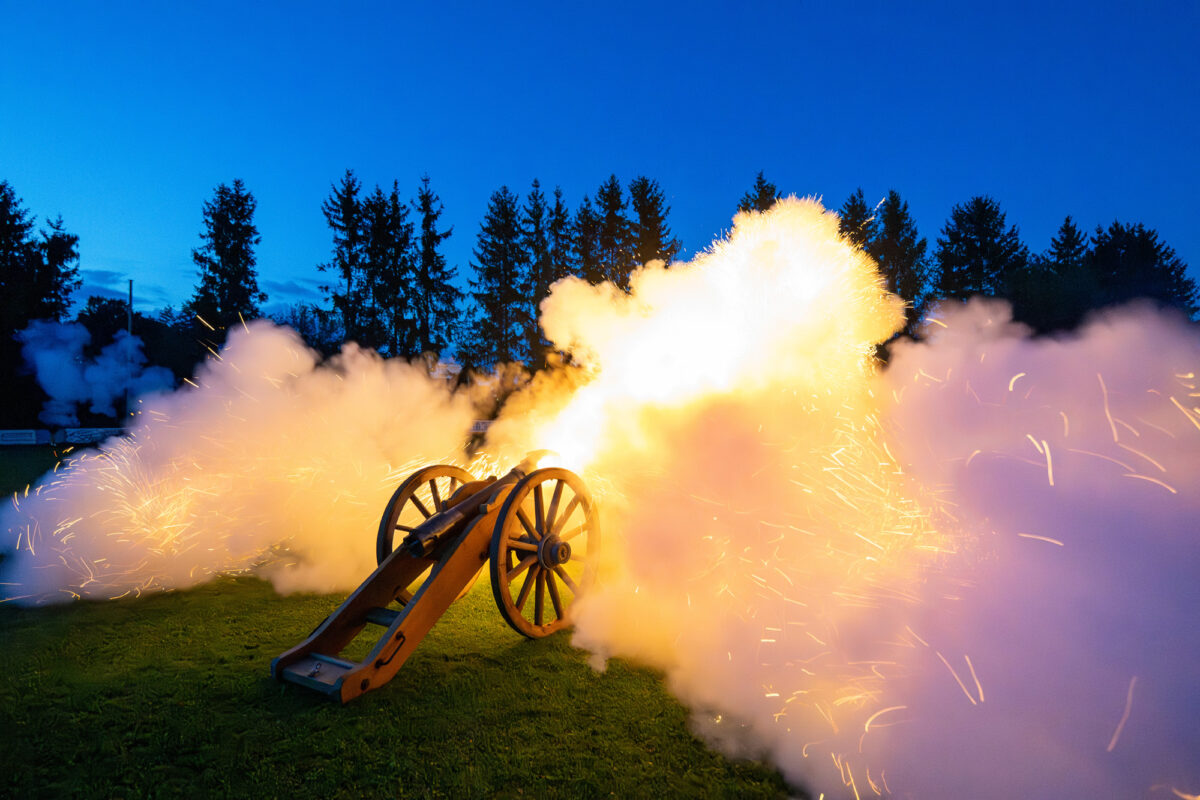 Am Abend luden die Schützen zum Fest mit Nachschießen der Böllergruppe ein. Viele der Gäste verfolgten das Böllern interessiert. Von 20 bis 21 wurde es dann laut auf dem Fußballplatz. 18 Schützen und eine Kanonier waren zum Event gekommen. Unter dem Kommando von Jürgen Landgraf wurden fünf Schussbilder abgefeuert. Reihensalut, langsames Reihenfeuer, Doppelschlag, schnelles Reihenfeuer und ein Abschlusssalut feuerten die Schützen ab.