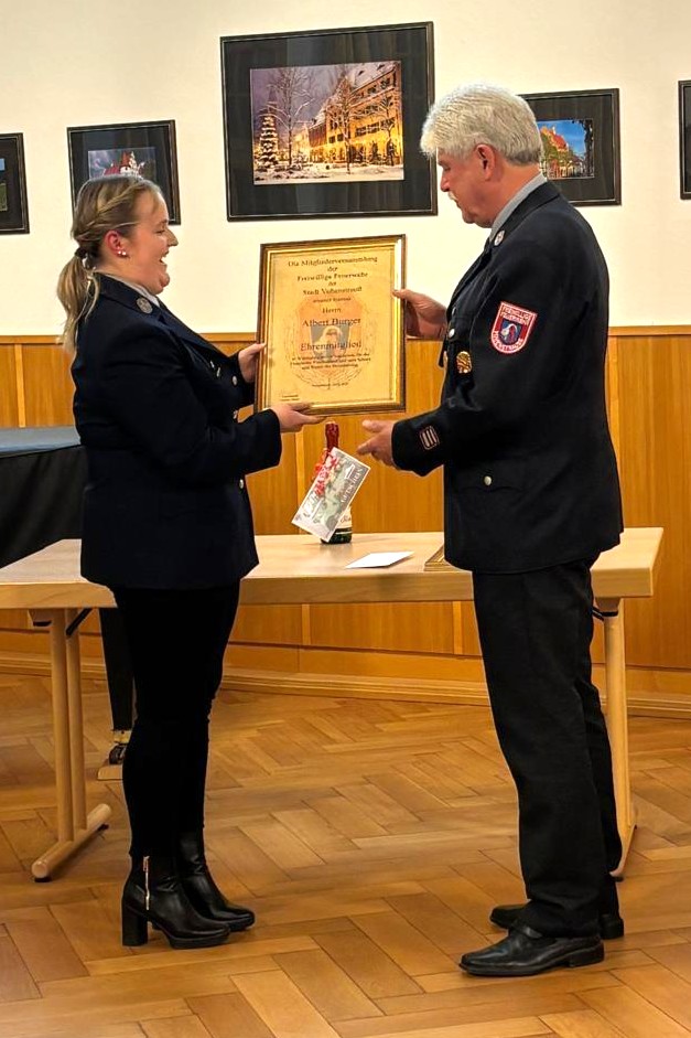 Vorsitzende Corinna Beierl zeichnete den bisherigen stellvertretenden Kommandanten Albert Burger für 47 Jahre Dienstzeit aus. Burger trat am 16. März 1978 ein, absolvierte 1981 den Atemschutzlehrgang und übernahm 1983 die Aufgabe als Atemschutz-Gerätewart. Gemeinsam mit Günter Sommer etablierte er einen Atemschutzlehrgang in Vohenstrauß, der die Ausbildung im gesamten KBI-Bezirk deutlich stärkte.