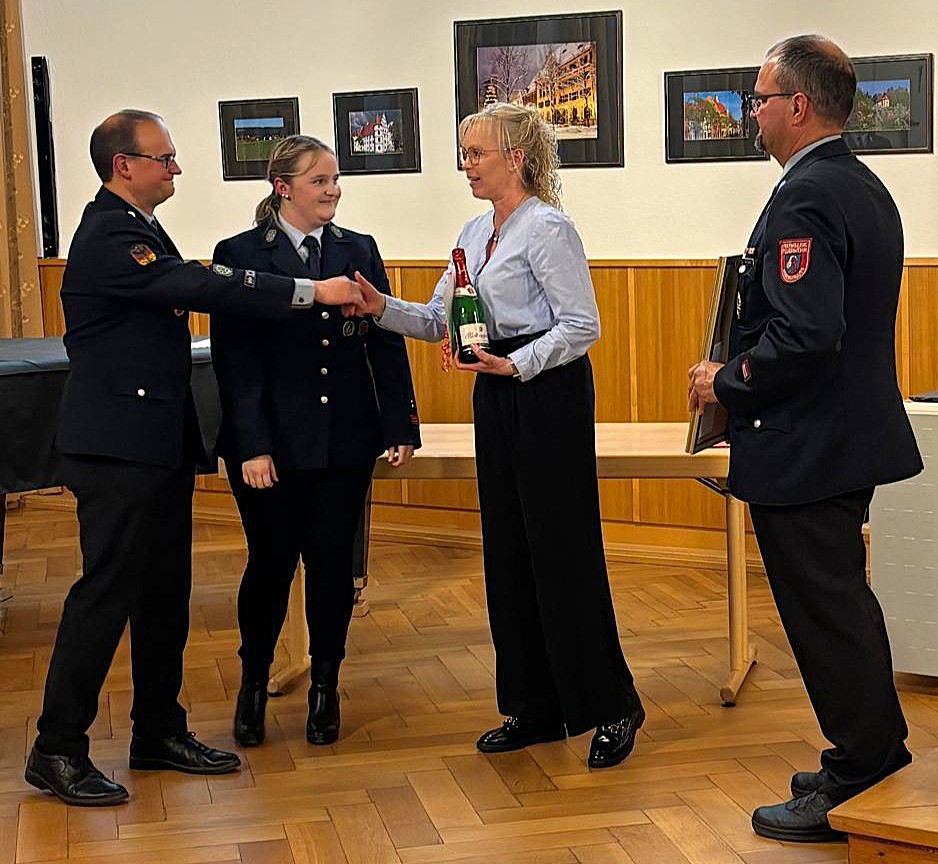 Erster Bürgermeister Andreas Wutzlhofer gratulierte den Geehrten und dankte für die langjährige Arbeit zum Wohl der Feuerwehr, der Stadt und ihrer Bürger. Er würdigte die Geehrten als zuverlässige Kameraden und als Vorbilder für die Jugend. Zum Ausklang lud Corinna Beierl die Gäste zur gemütlichen Runde ein, während Helferinnen ein kleines Buffet mit herzhaftem und süßem Gebäck vorbereitet hatten.