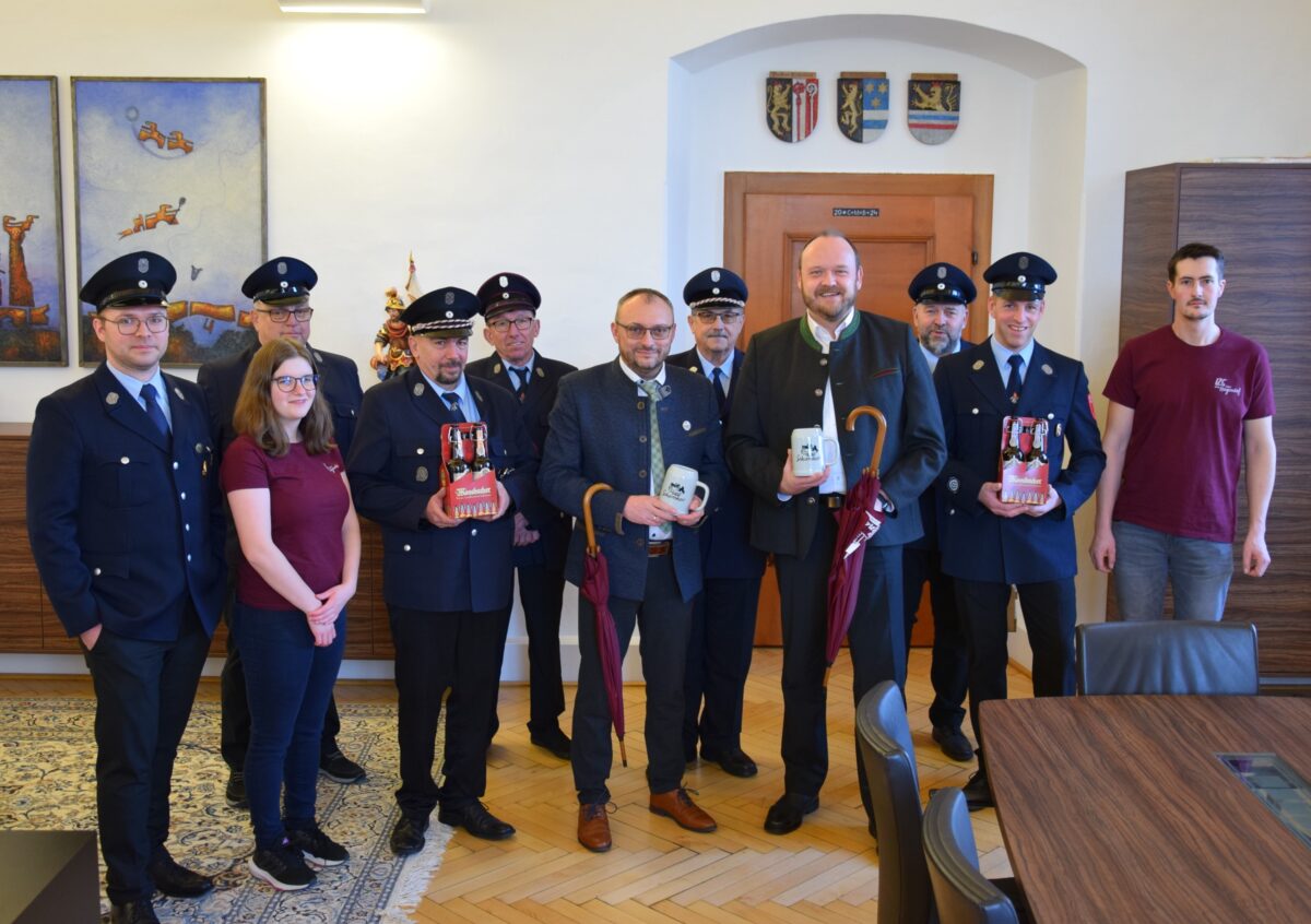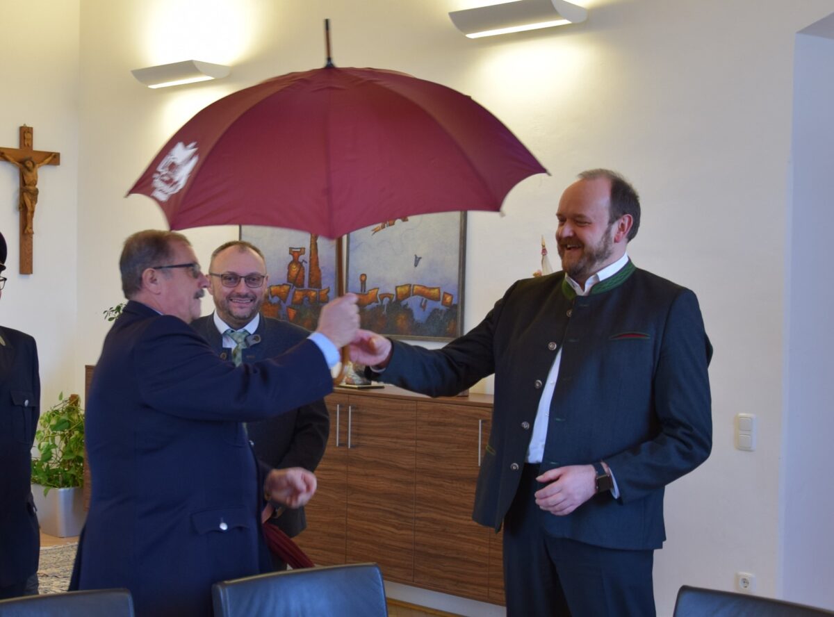 Als aktive Unterstützer stehen Landrat Andreas Meier und Bürgermeister Markus Bauriedl der Feuerwehr Hagendorf zur Seite. Der Vorsitzende Hermann Gilch übergab die symbolischen Schirme an die beiden vorfreudigen Schirmherren. In altbewährter Tradition trug der Festleiter Benjamin Schmalnauer die Bitte der Feuerwehr in Reimform vor. Beide Schirmherren versprachen, ihr Bestes zu geben und hoffen auf gutes Wetter für das Großereignis.