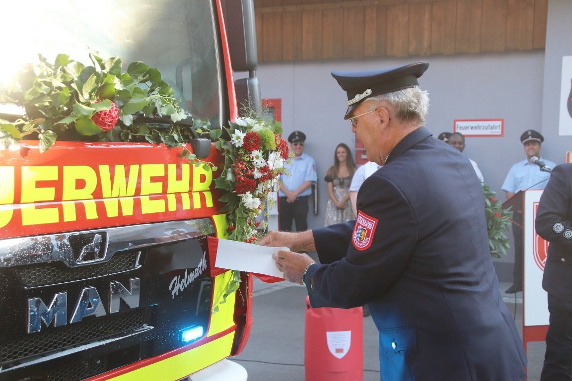 Fahrzeugpate des neuen Löschfahrzeugs ist kein geringerer als Altbürgermeister Helmut Wächter, der das mit einer Sektdusche für den Wagen feiert.
