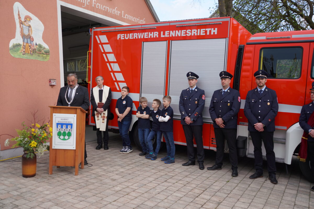 Bürgermeister Josef Beimler würdigte die gute Zusammenarbeit zwischen Gemeinde und Feuerwehr. „Feuerschutz ist eine kommunale Pflichtaufgabe der Gemeinde“. Trotz anfänglicher Diskussionen über Größe und Notwendigkeit habe sich gezeigt, dass die Entscheidung für das TSF-L richtig gewesen sei. Das Fahrzeug sei ein „Wunschfahrzeug“, das optimal auf die Anforderungen im Einsatzgebiet zugeschnitten sei. Sämtliche Beschlüsse hinsichtlich des neuen Einsatzfahrzeugs der Lennesriether Feuerwehr seien im Marktrat einstimmig gewesen. Beimler übergab dann den Fahrzeugschlüssel offiziell an den Kommandanten Michael Stahl.