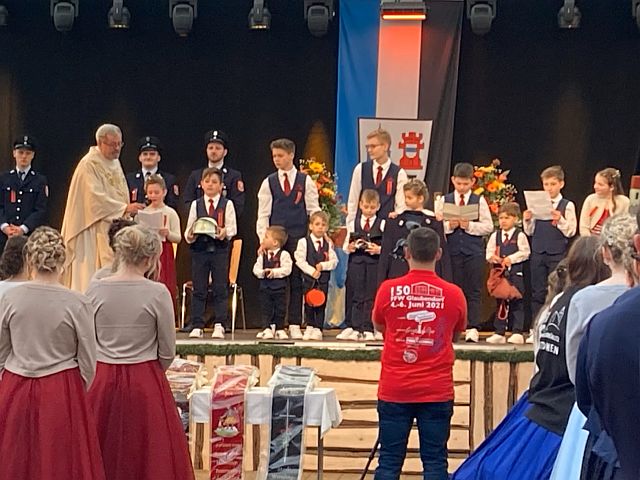 Bereits am Sonntagmorgen fand im Festzelt der Festgottesdienst mit Pfarrer Markus Ertl statt. Hier wurde besonders der Gründer der Feuerwehr gedacht. Die Festmesse wurde von der Gleiritscher Musikkapelle unter der Leitung von Paul Braun umrahmt. Markus Ertl betonte in seiner Predigt, dass dieser Gottesdienst für den Glauben eine Übung sei, um stürmische Zeiten standzuhalten, sowie es bei der Feuerwehr auch die Übungen geben muss, um stets bei Einsätzen gewappnet zu sein. Zum Ende der kirchlichen Zeremonie wurden vom Geistlichen die Erinnerungsbänder gesegnet. Sie wurden unter anderem von der Schirmherrin Marianne Schieder mit Ehrenschirmherrn Bürgermeister Konrad Kiener, der Festbraut Magdalena Stahl, mit verschiedenen Prologen an die jeweiligen Fahnen gehängt.