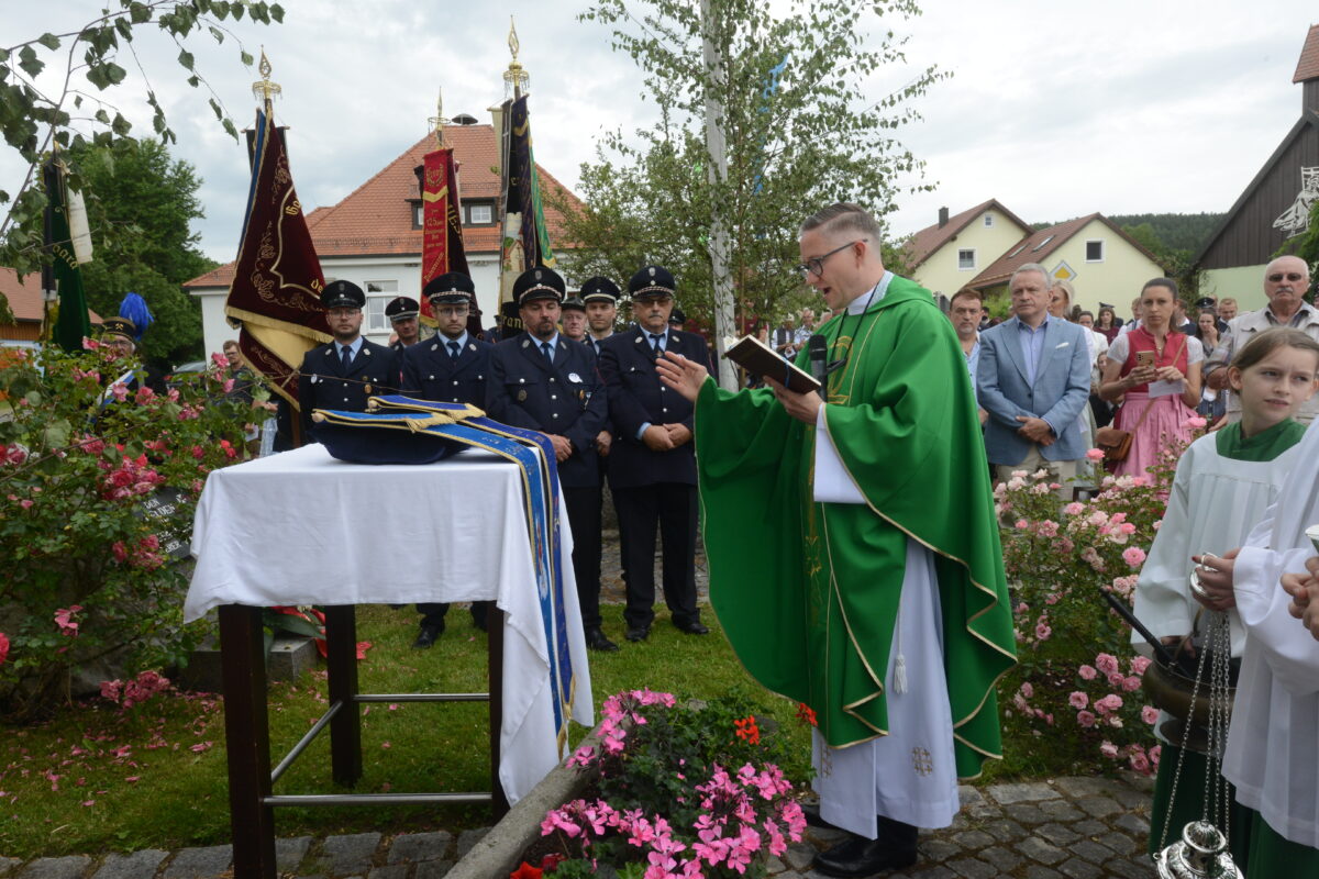Am Sonntagmorgen fand vor der Barbara-Kapelle in Hagendorf der Festgottesdienst statt. Die Mitglieder des Katholischen Frauenbundes Miesbrunn hatten vor die Kapelle einen Blumenteppich verlegt. Stadtpfarrer Adam Karolczak hob in seiner Ansprache hervor, dass der Glaube bei allen Generationen der Wehr eine große Rolle gespielt habe, was wiederum in Hagendorf deutlich mit dem großen Bild des Heiligen Florians am Feuerwehrhaus deutlich gemacht wird.