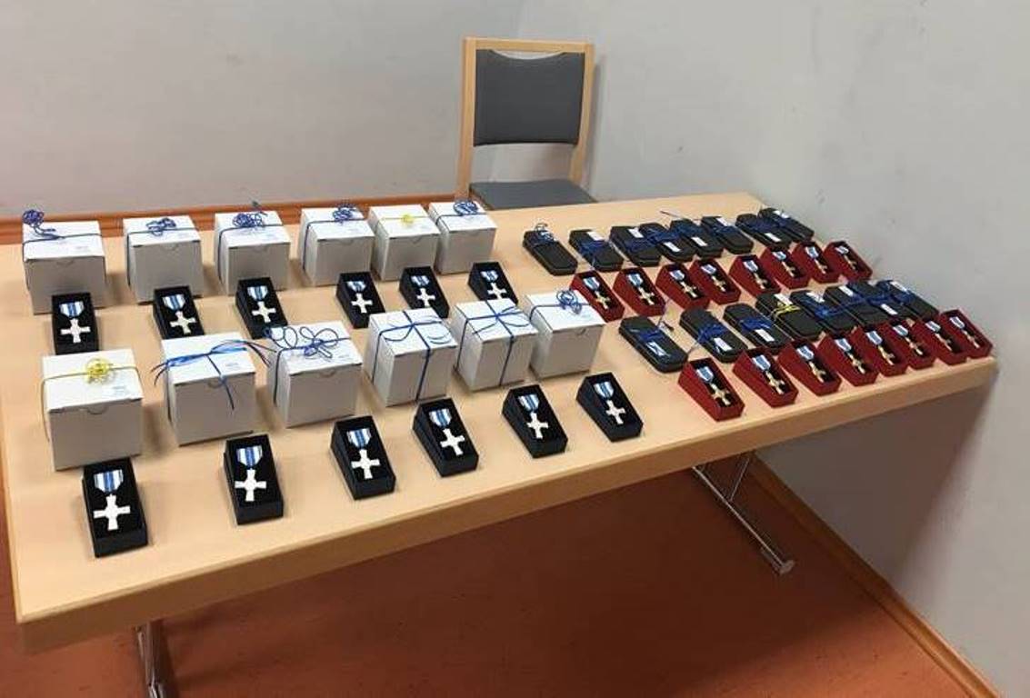 Im Inspektionsbereich West hat Meier 16 staatliche Ehrenzeichen in Gold für 40 Jahre aktiven Dienst und zwölf staatliche Ehrenzeichen in Silber für 25 Jahre überreicht. Was sonst eine große Feier mit vielen Gästen ist, musste wegen Corona deutliche Einschränkungen erfahren. So waren neben den Geehrten nur der jeweilige Kommandant der Feuerwehr und der Bürgermeister der Gemeinde eingeladen. Landrat Meier verzichtete auf das persönliche Anheften der Ehrenzeichen ans Revers der Ehrenamtlichen. Stattdessen lagen diese samt Geschenk auf einem Tisch zur Abholung bereit. Statt eines gemeinsamen Fotos aller Geehrten, gab es Einzelbilder der jeweiligen Feuerwehren, um den notwendigen Abstand zu waren.
