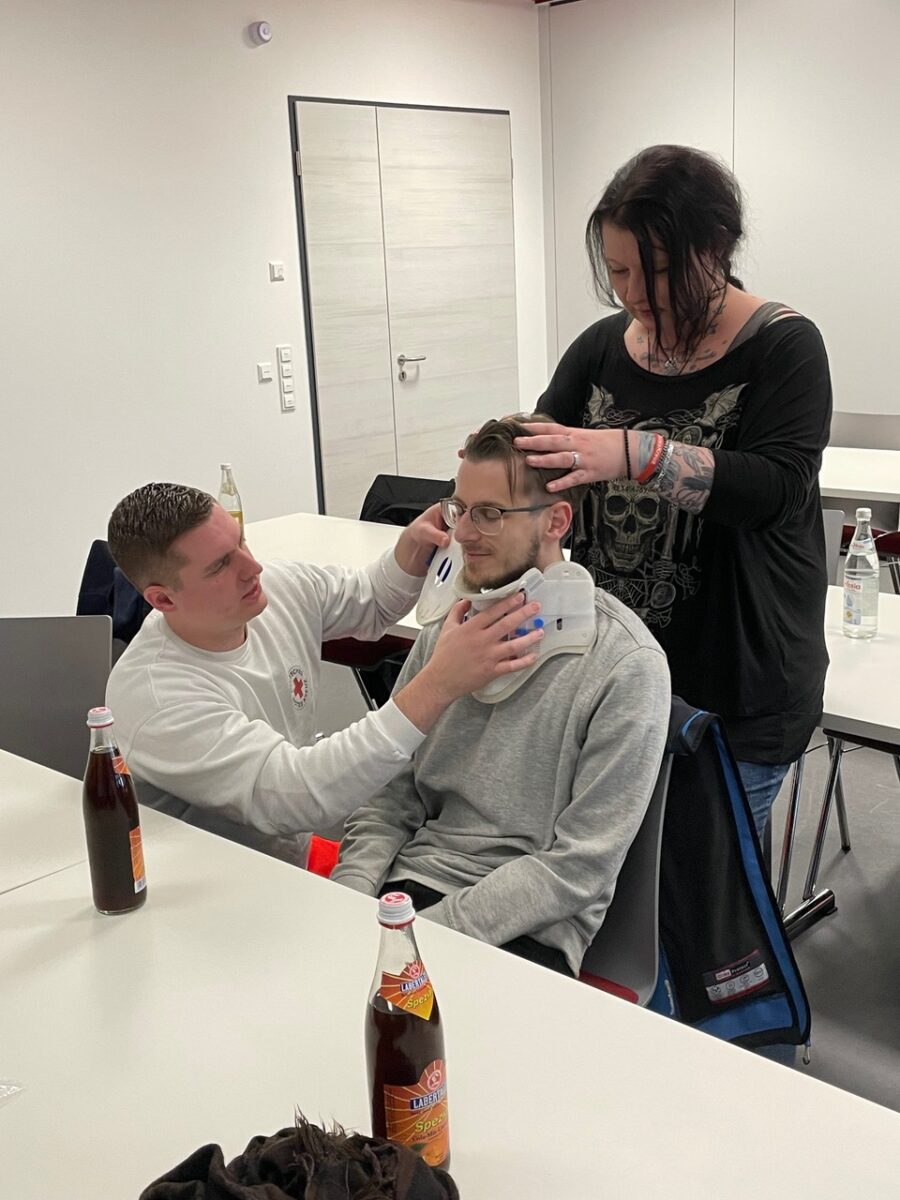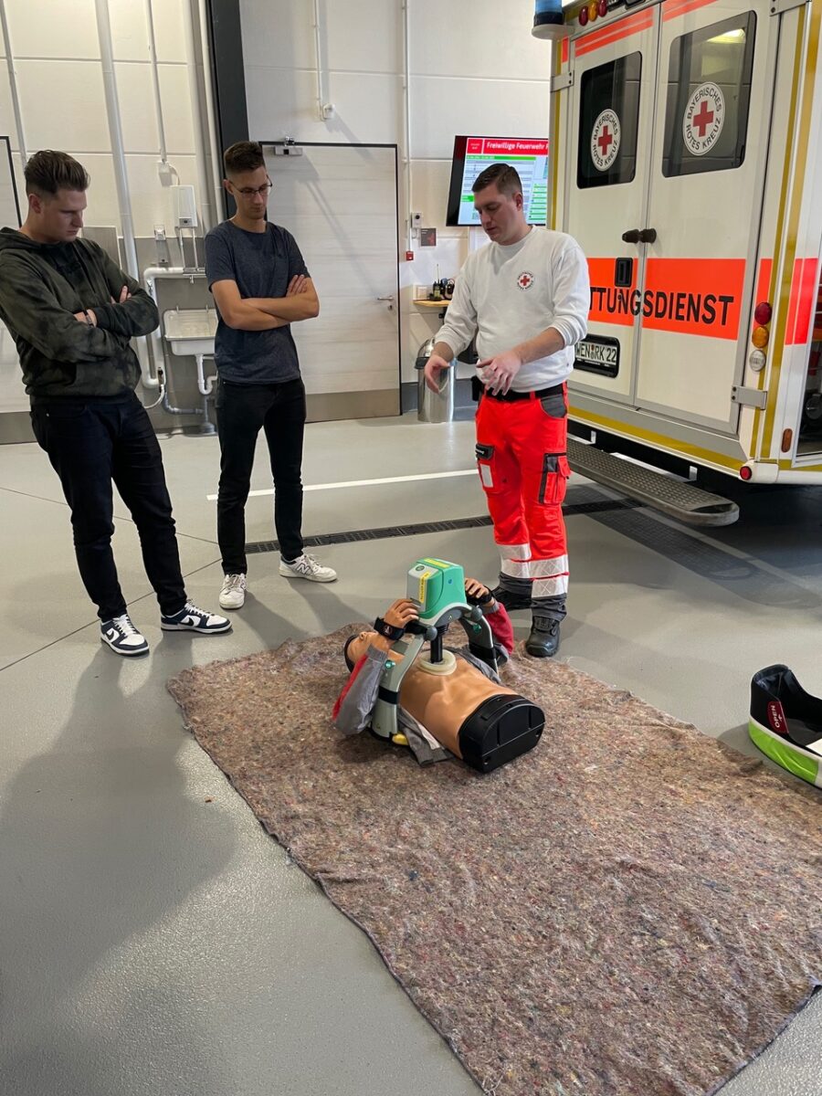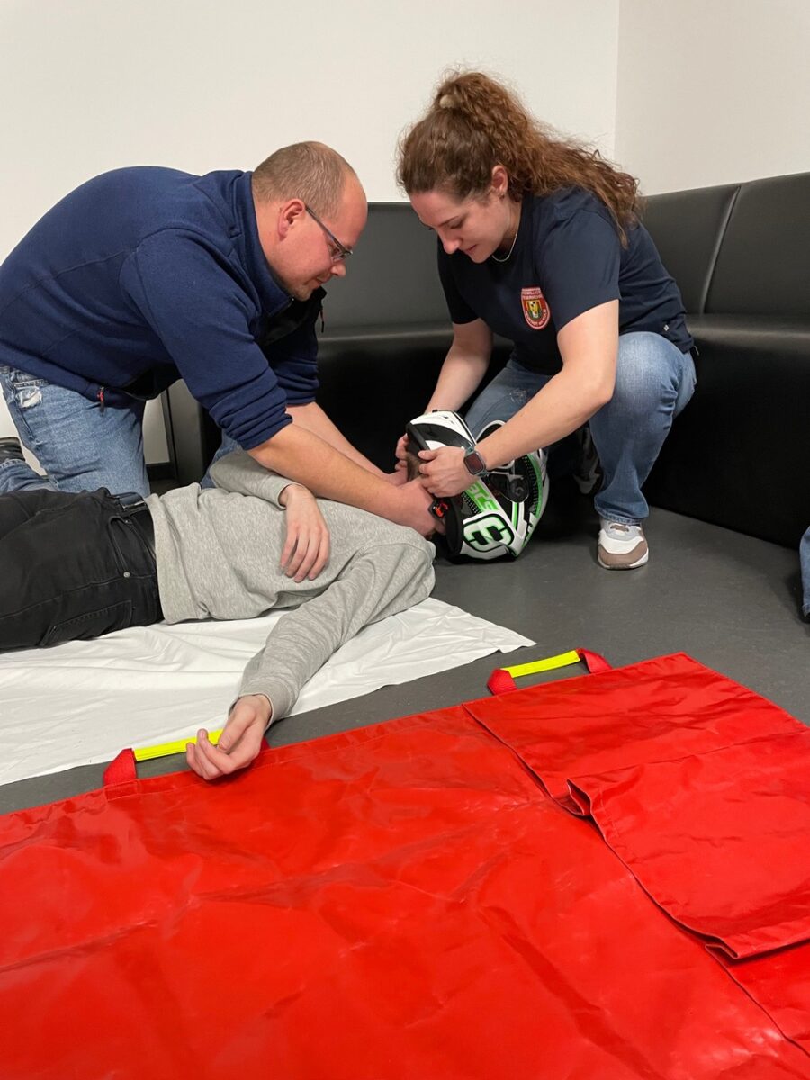 Nach einer kurzen Pause ging es um die Versorgung von Wunden und Blutungen, Amputationsverletzungen, das Anlegen einer Abbindung mittels eines sog. Tourniquets sowie um die Ruhigstellung von Knochenbrüchen. Außerdem hatten die Teilnehmer die Gelegenheit, die stabile Seitenlage zu üben und die mechanische Reanimationshilfe des Rettungsdienstes, LUCAS 2, kennenzulernen.