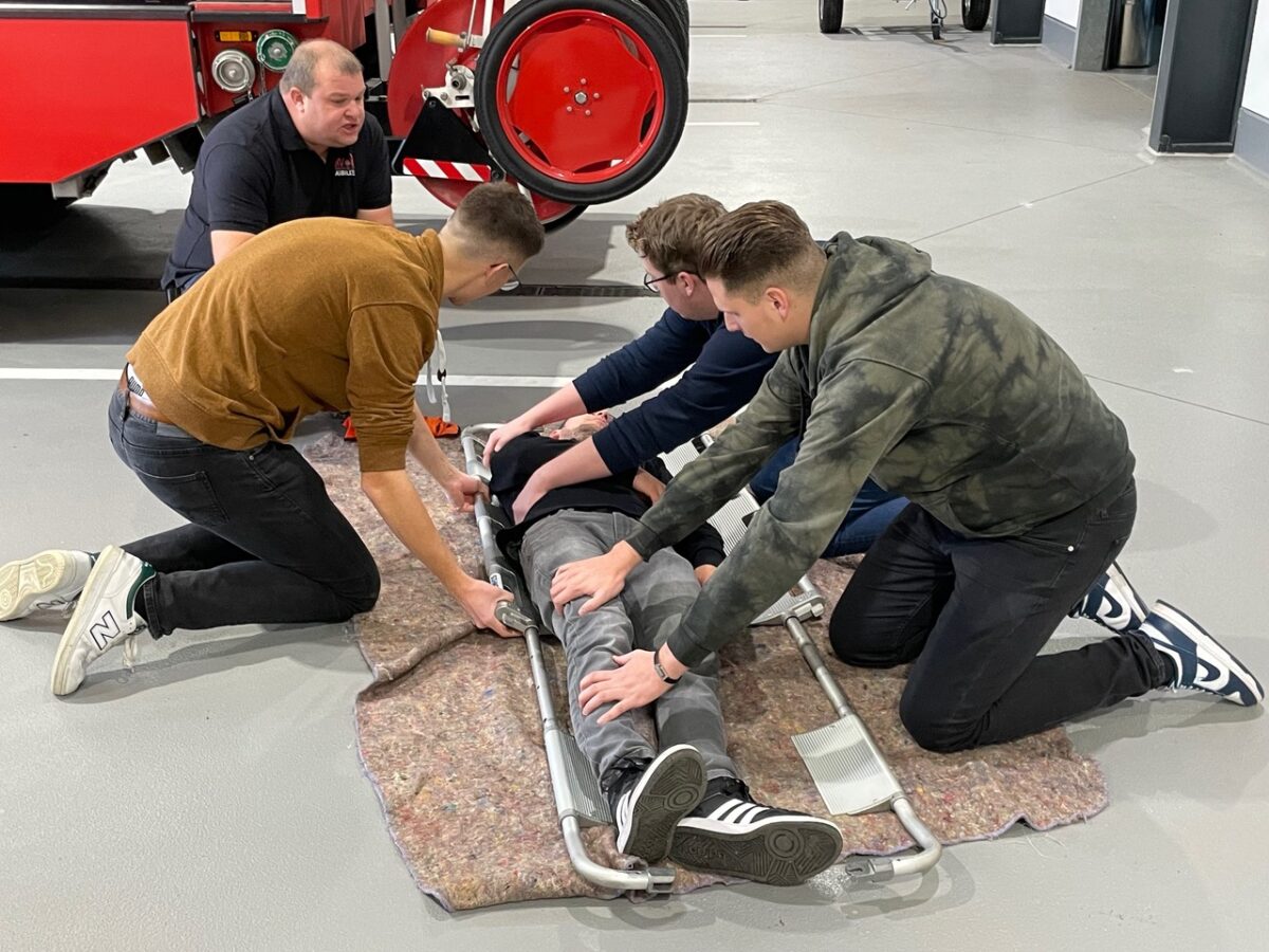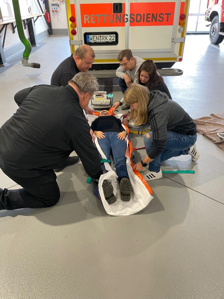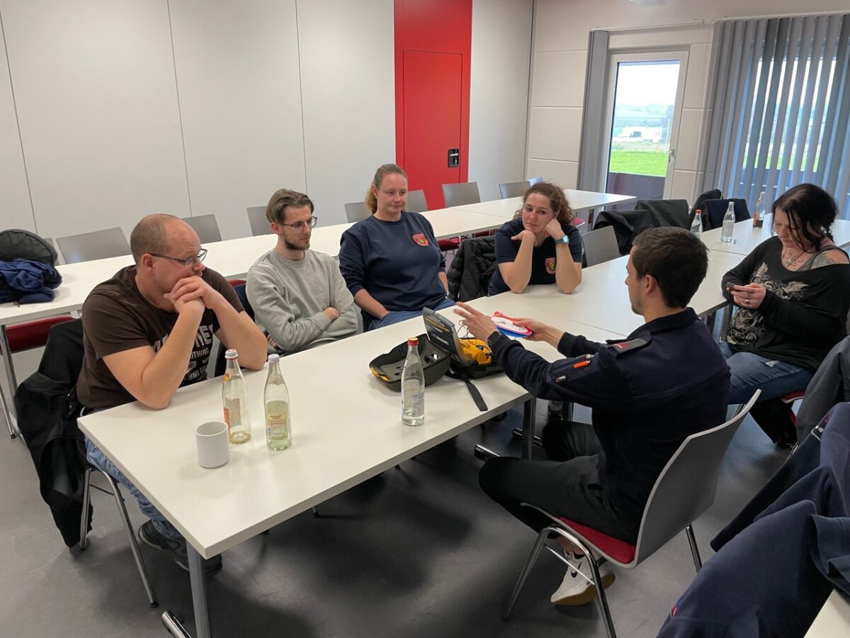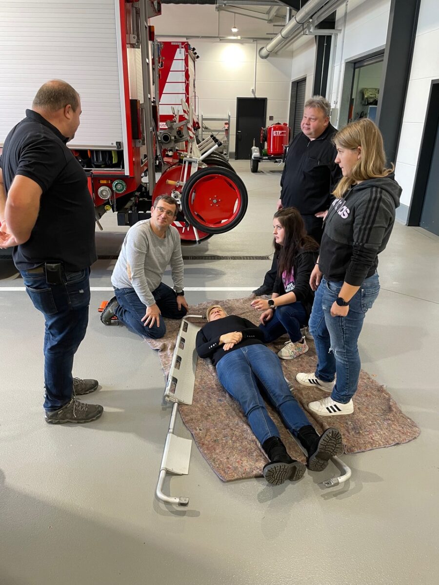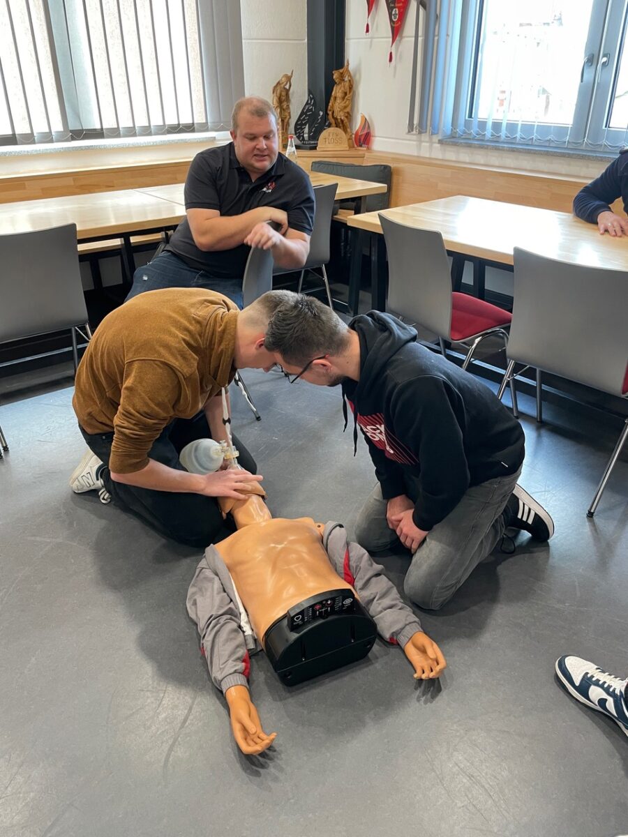 Dann ging es für die Teilnehmerinnen und Teilnehmer ans Eingemachte. In zwei Gruppen galt es, realistisch inszenierte Notfallszenarien realitätsnah abzuarbeiten. Wichtiges Ziel der Ausbildung war es hier, den Teilnehmern zu vermitteln, dass es einen Teamleiter geben muss. So gelang es den Feuerwehrkameradinnen und -kameraden, eine Reanimation fünfzehn Minuten lang fortzusetzen, bis der Notarzt und Rettungsdienst eintrafen.