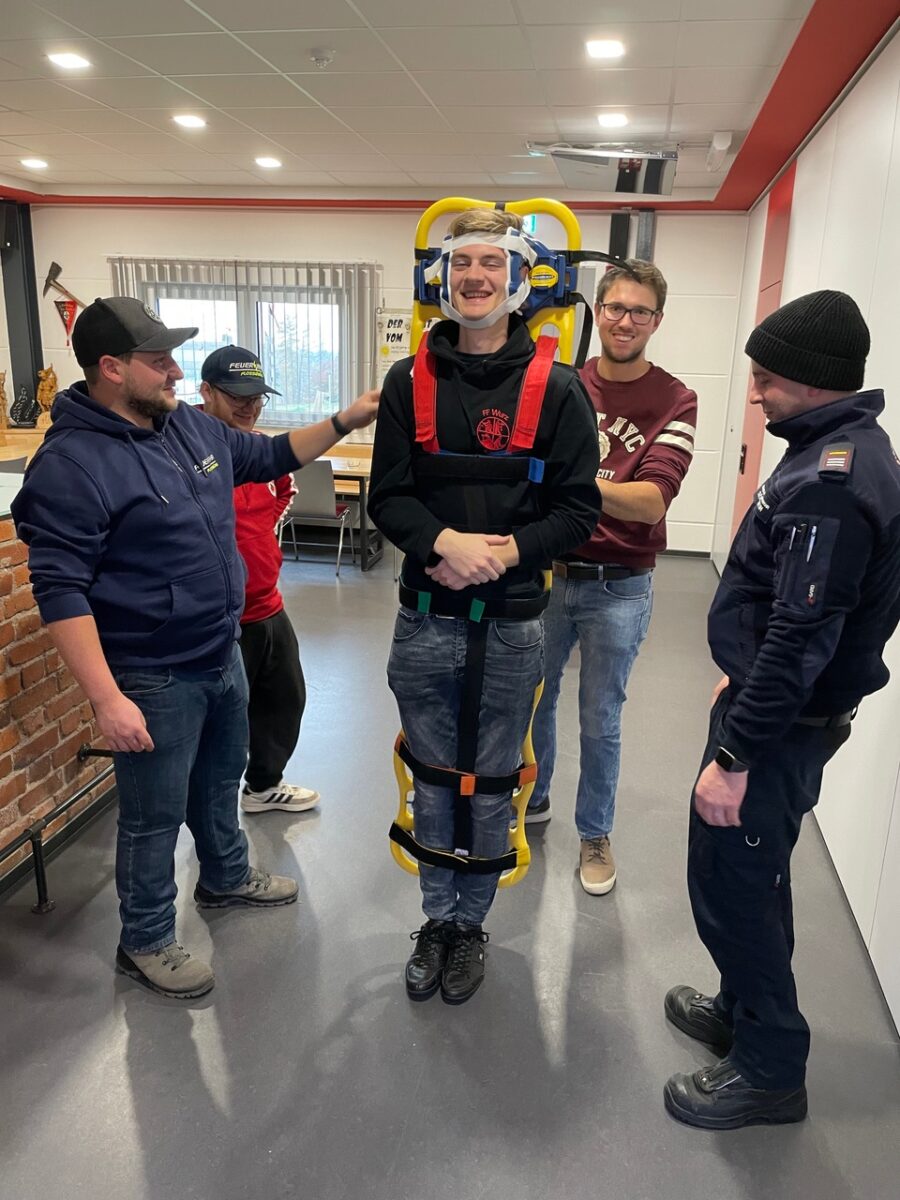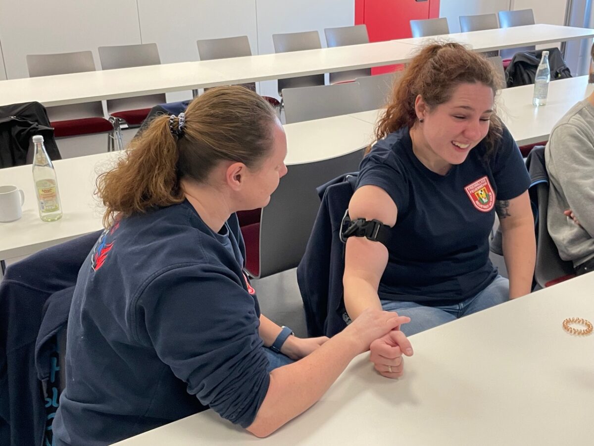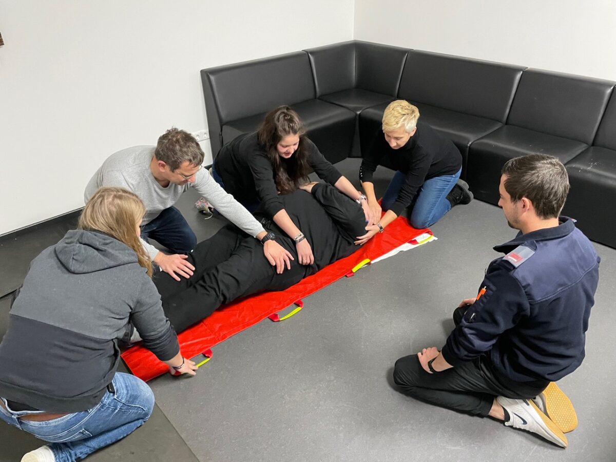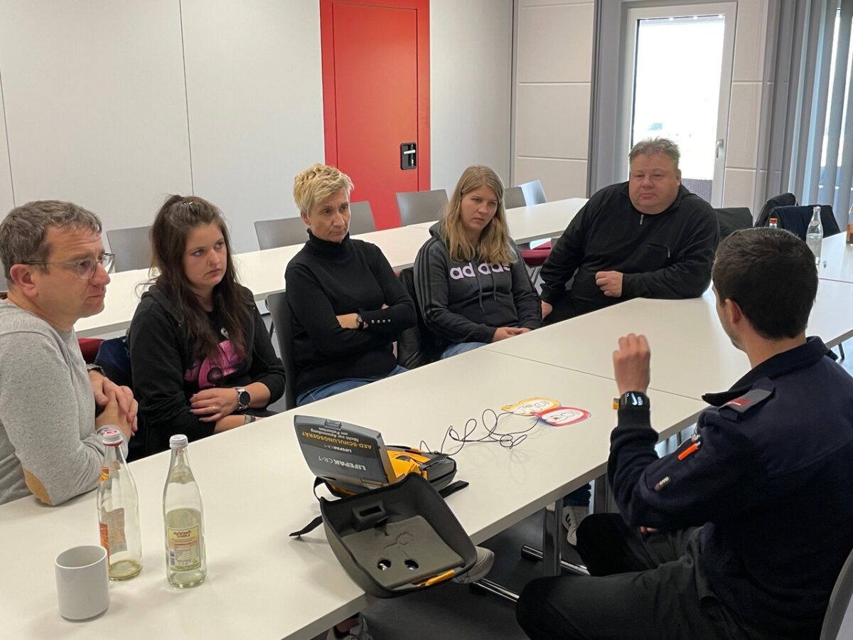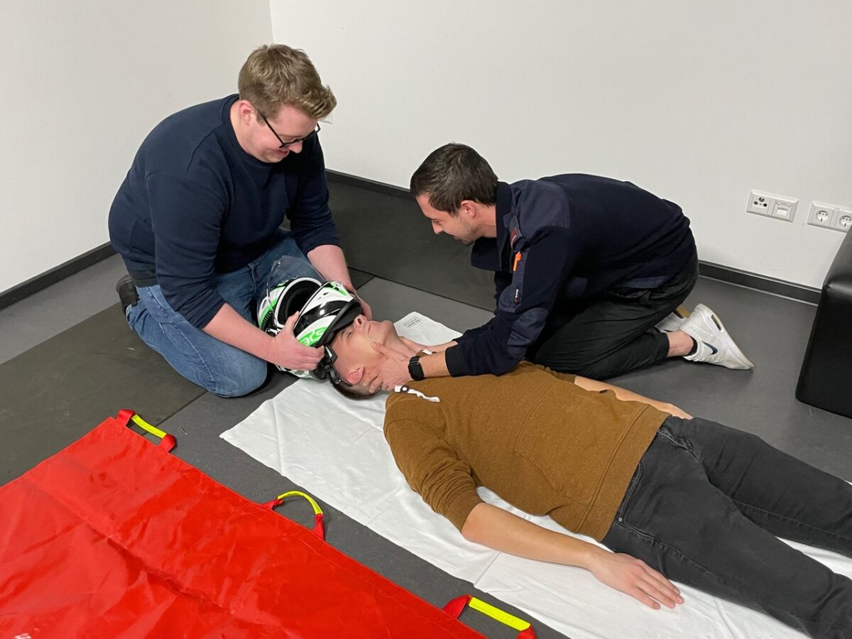 Dann ging es für die Teilnehmerinnen und Teilnehmer ans Eingemachte. In zwei Gruppen galt es, realistisch inszenierte Notfallszenarien realitätsnah abzuarbeiten. Wichtiges Ziel der Ausbildung war es hier, den Teilnehmern zu vermitteln, dass es einen Teamleiter geben muss. So gelang es den Feuerwehrkameradinnen und -kameraden, eine Reanimation fünfzehn Minuten lang fortzusetzen, bis der Notarzt und Rettungsdienst eintrafen.