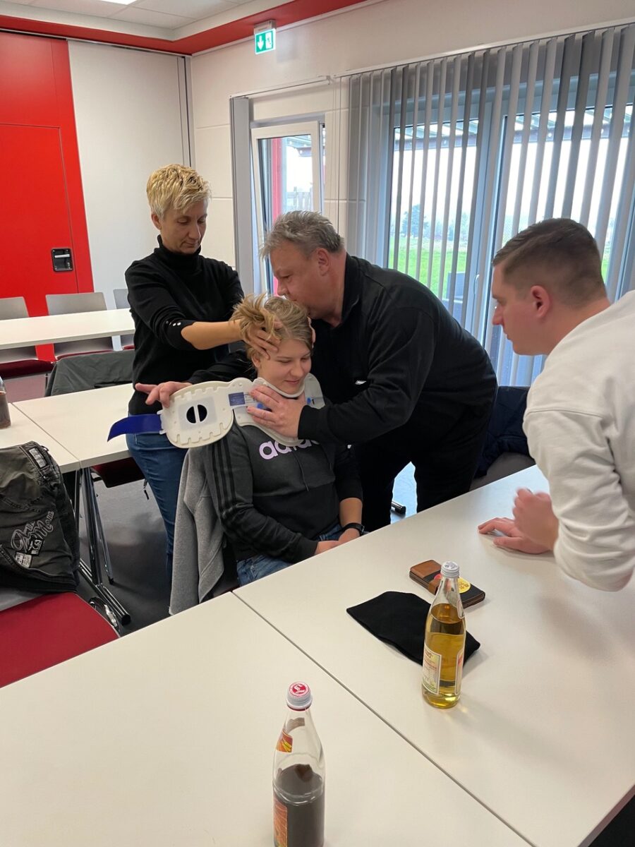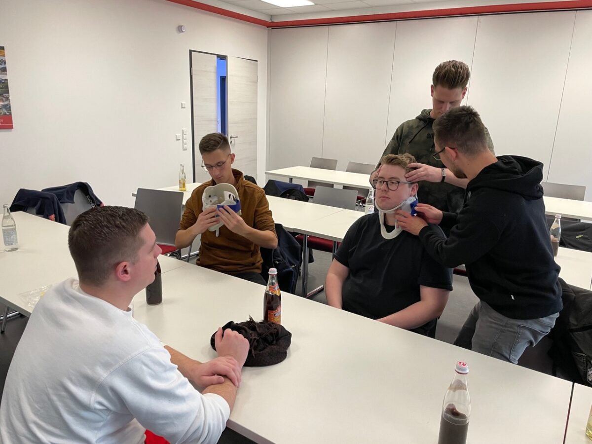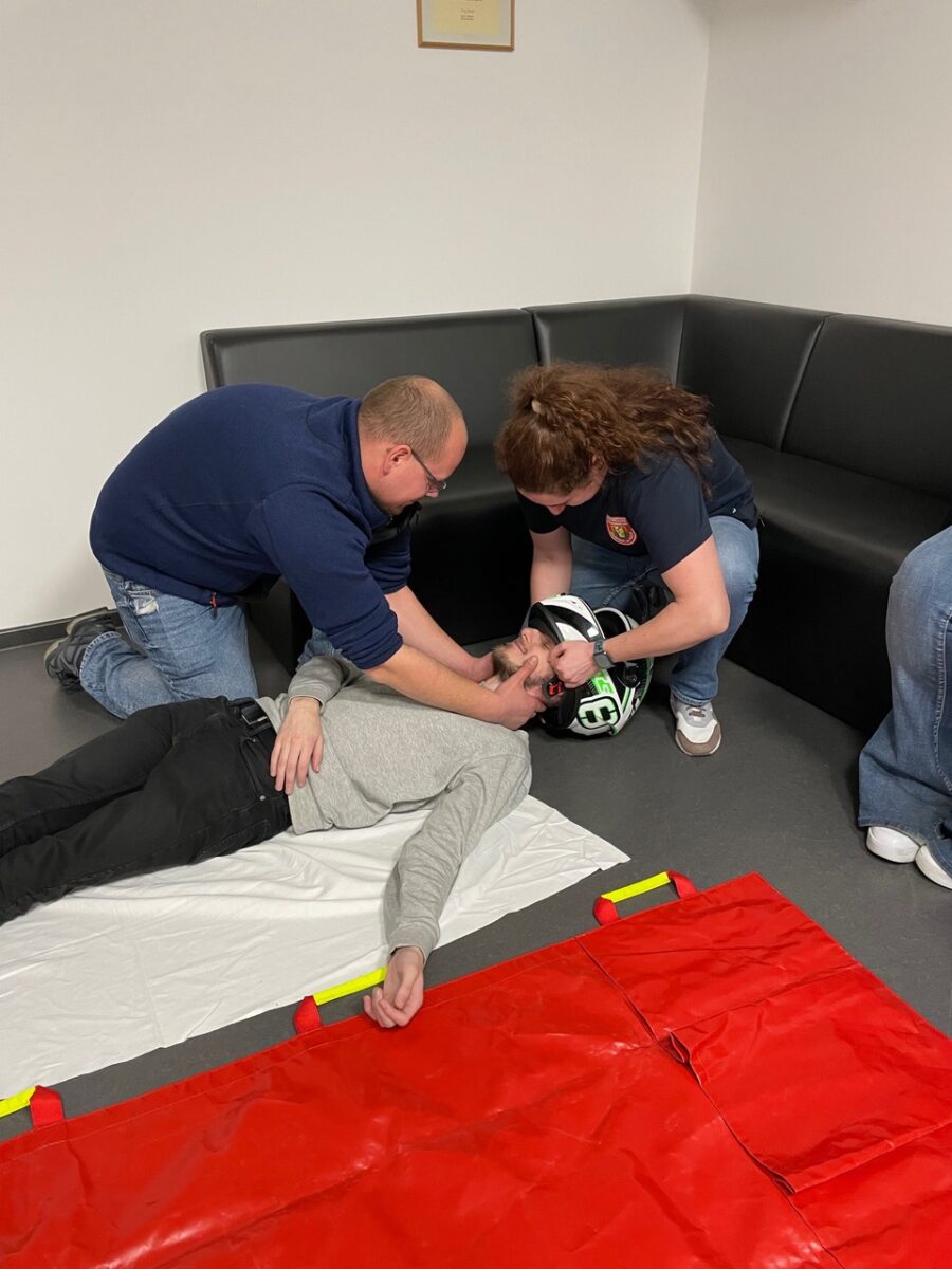 Im zweiten Teil des Lehrgangs am Samstag stand dann die Praxis im Vordergrund. Nach einer kurzen Vorstellung der Ausbilder wurden die Teilnehmer in Kleingruppen aufgeteilt. Die Teilnehmerinnen und Teilnehmer übten, wie ein Helm abgenommen oder eine Halskrause (Stiff neck) angelegt wird. Sie übten die Rettung aus Fahrzeugen ohne Hilfsmittel und mit dem sog. KED-System sowie den Patiententransport mit Tragetuch, Schaufeltrage, Vakuummatratze oder Spineboard.