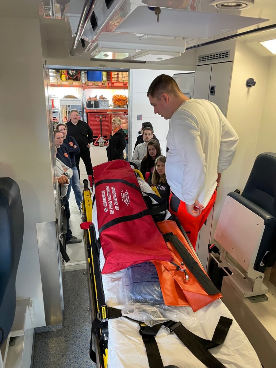 Nach der Mittagspause referierte Rüdiger Hettler über die Symptome und die Versorgung eines Herzinfarkts einschließlich der Herz-Lungen-Wiederbelebung beim Herz-Kreislauf-Stillstand sowie über die Behandlung des Herzinfarkts durch den Notarzt und im Krankenhaus. Anschließend stellte Johannes Windschiegl den Teilnehmern die Ausrüstung eines Rettungswagens vor.