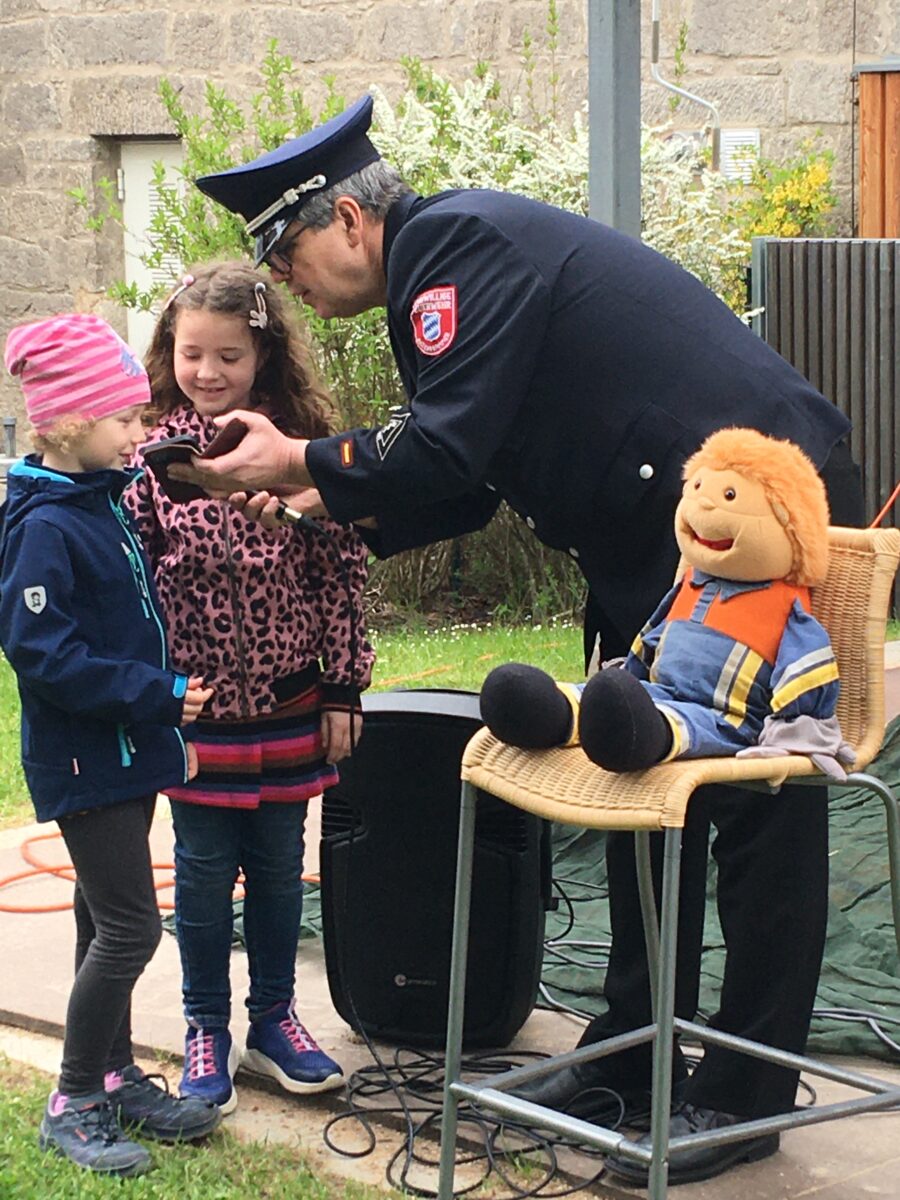 Als die Feuerwehrmänner ihr schweres Atemschutzgerät auspackten, wurde es einigen Kindern angesichts der Maske und der Flammenschutzhaube doch etwas mulmig zumute. Doch Hettler und Klettner nahmen den Kindern jegliche Ängste und ihre Handpuppe mit dem Namen „Fix“ unterstützte sie dabei.
