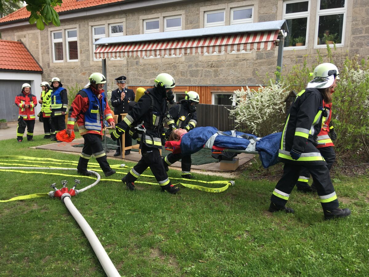 Zeitgleich wurde ein Generator aufgebaut, der den Rauch aus den Räumen blies. Die Atemschutzträger retteten die vermisste Person, Franziska Beer, aus dem „brennenden“ Kindergarten. Während der Feuerwehrübung kommentierte und erläuterte Kommandant Rüdiger Hettler die einzelnen Arbeitsschritte und Arbeitsabläufe.